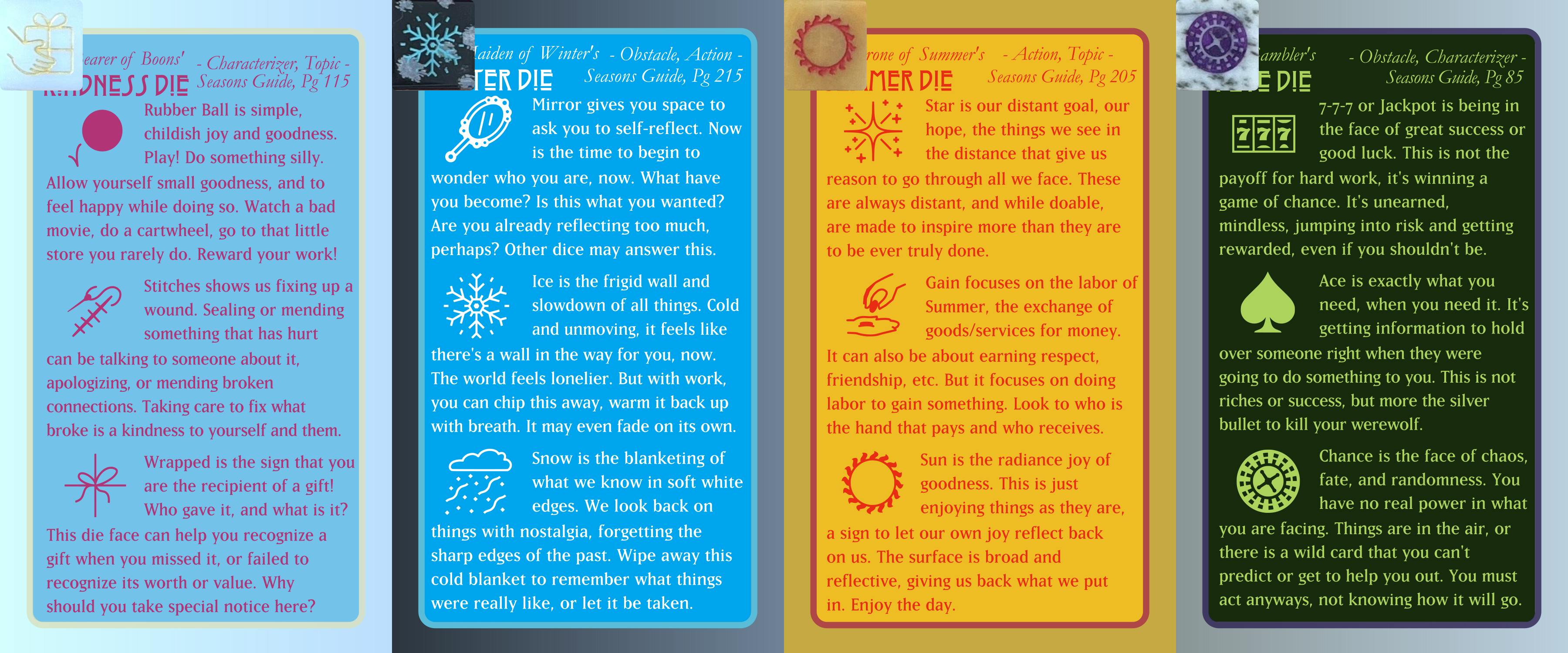 Cheat Sheets now have a border with the coloration of their stone dice, and a border line with the ink color of that stone die. This does a couple things: It addresses some folks want, stone dice awareness in the set, and it brought the info in on each card a bit so it won't get cut off. Stone dice overlaid here aren't on the actual cards, I just did that so you could see the color matching. I also tagged each die's card with what kind of die it is, Obstacle, Action, Topic, Characterizer, or Connection, as well as what page to find the full writeup and in what guidebook, in case you mix your cheat sheet cards between sets.