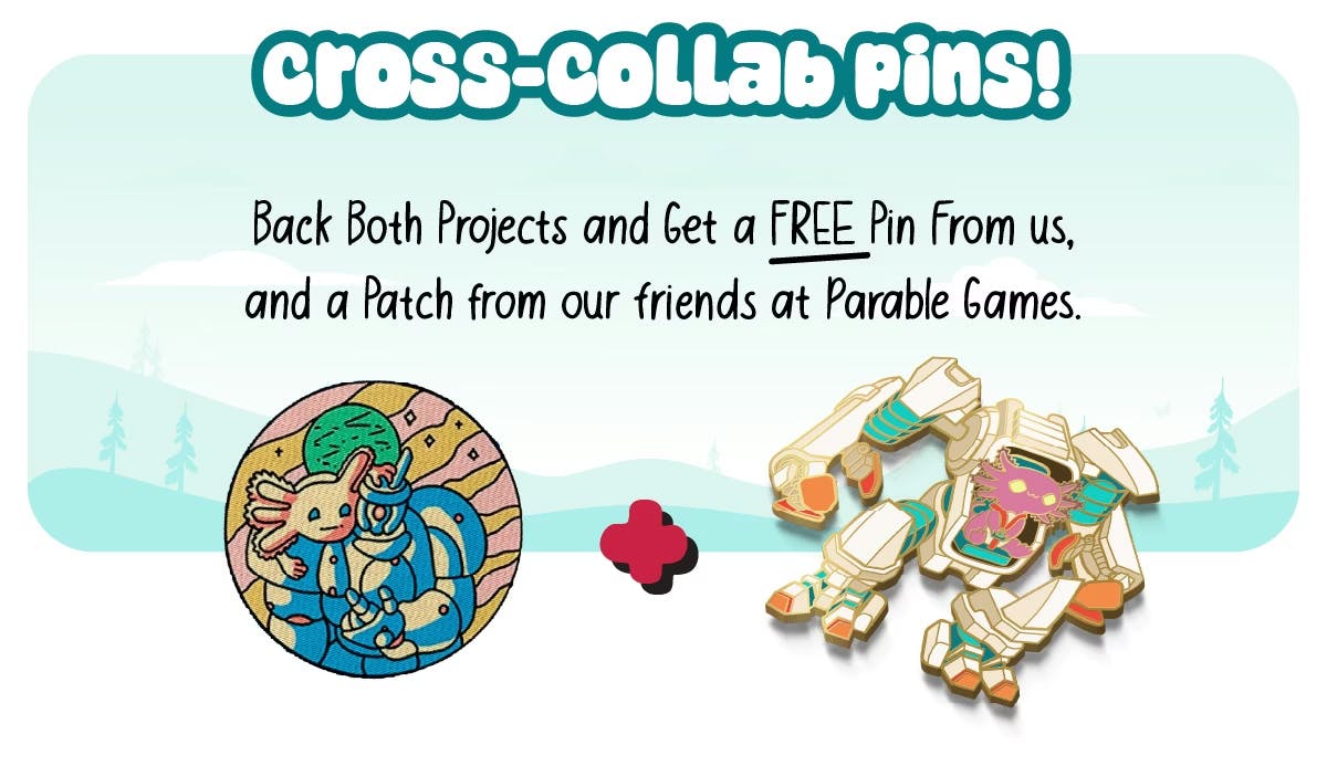 We've teamed up with Parable Games as Cross-Collab partners — this means that if you back BOTH projects in the pair (for a physical reward), you will get a limited FREE pin from us, and a cool patch from our partners! There will be a link right in the campaign when we launch on Thursday, making it super easy to earn these sweet rewards
