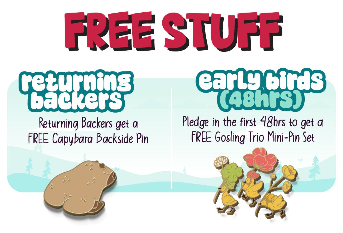 Mark your calendars for Thursday!!! ALL returning backers from ANY QuasiReal Publishing or CuddleCore project will get a FREE caked-up capybara pin, and everyone who backs in the first 48 hours gets these ultra cute gosling pins that literally made Heidi cry (If you look at Mama Goose closely, you'll see their gifts are in her bonnet)