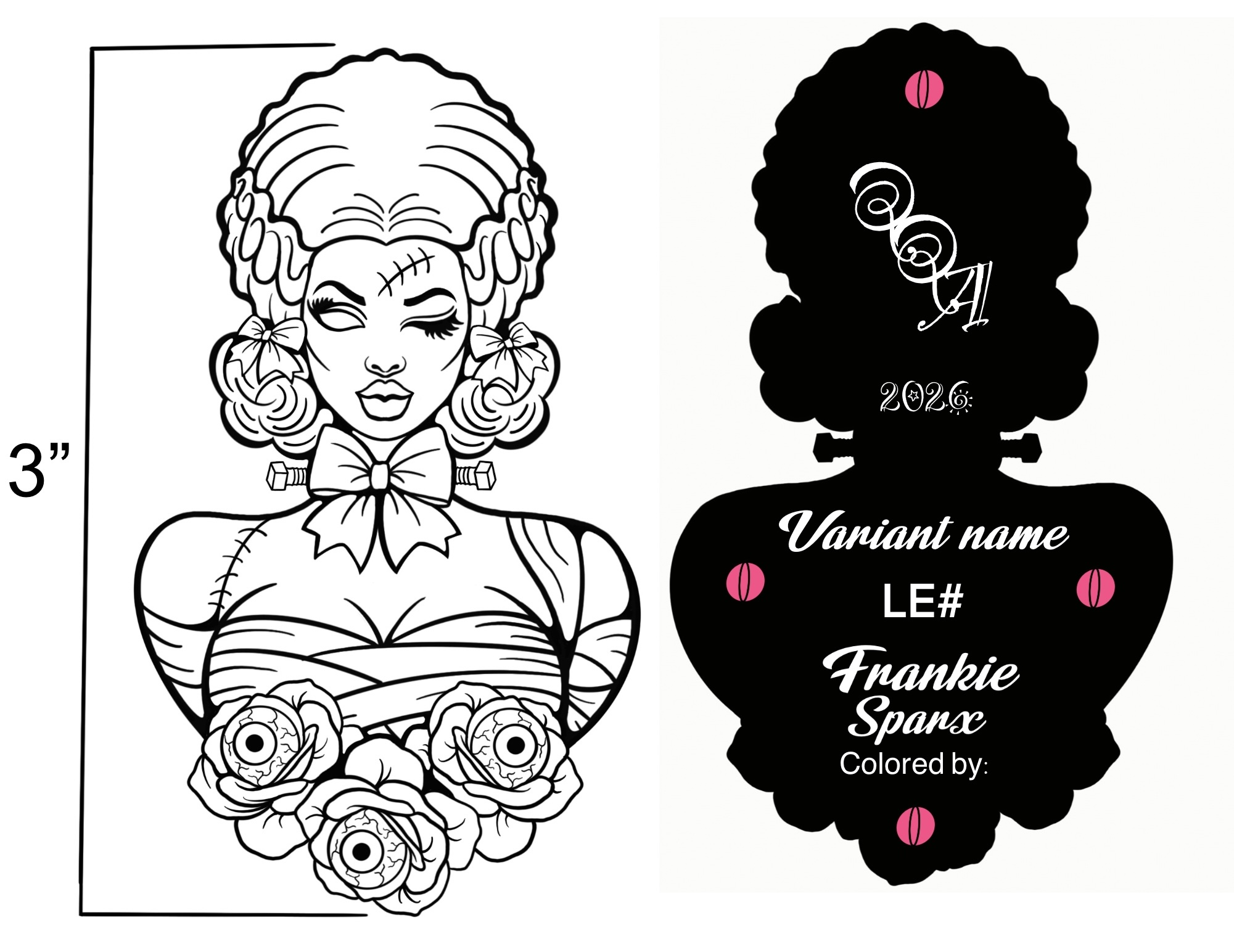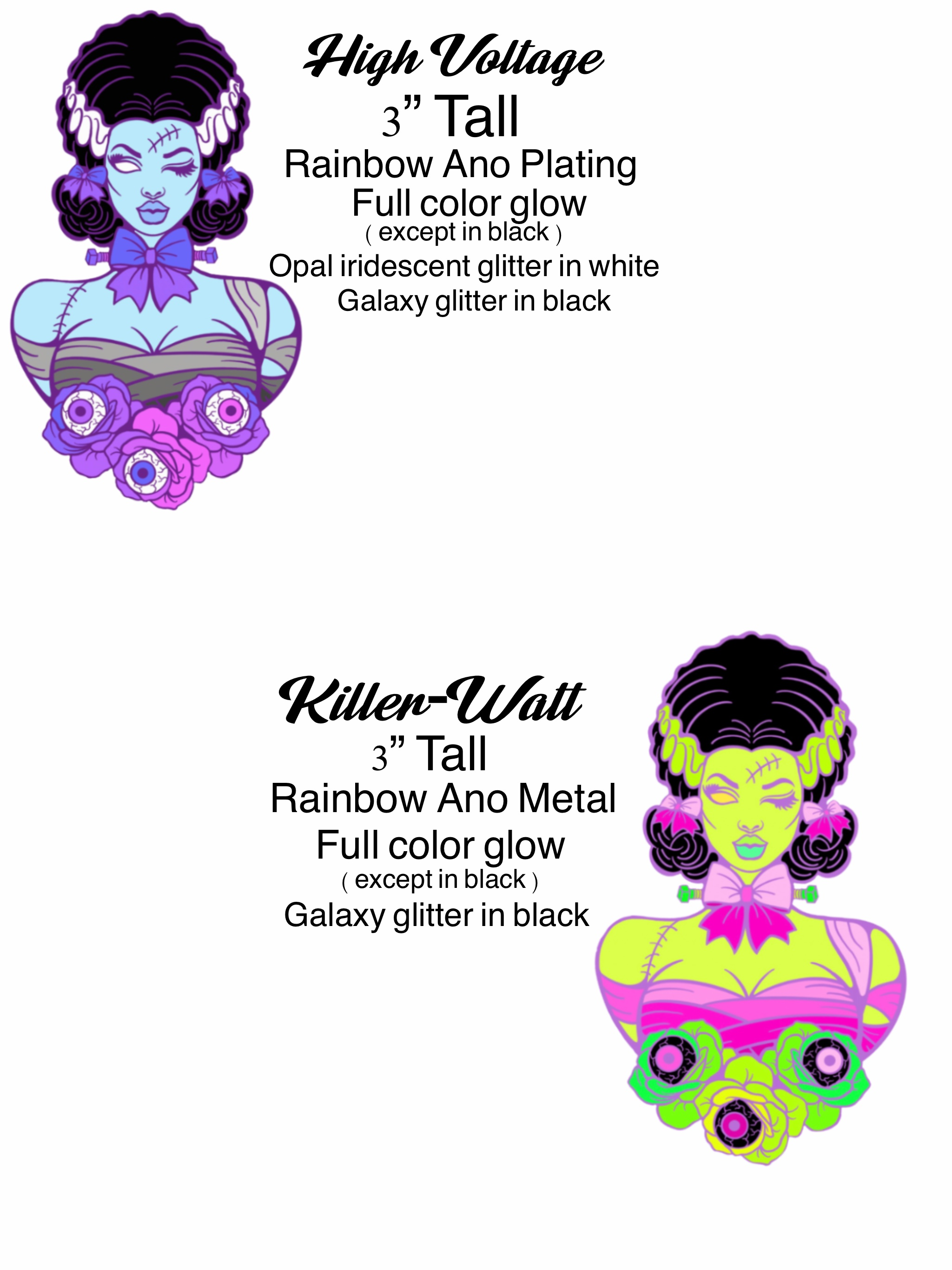 Frankie is the next pin of my art pin designs to be produced! She will be 3” tall, have plenty of glow in the dark features as well as glitter elements! These pins will BEGIN production in March, estimated shipping is around May/June.
