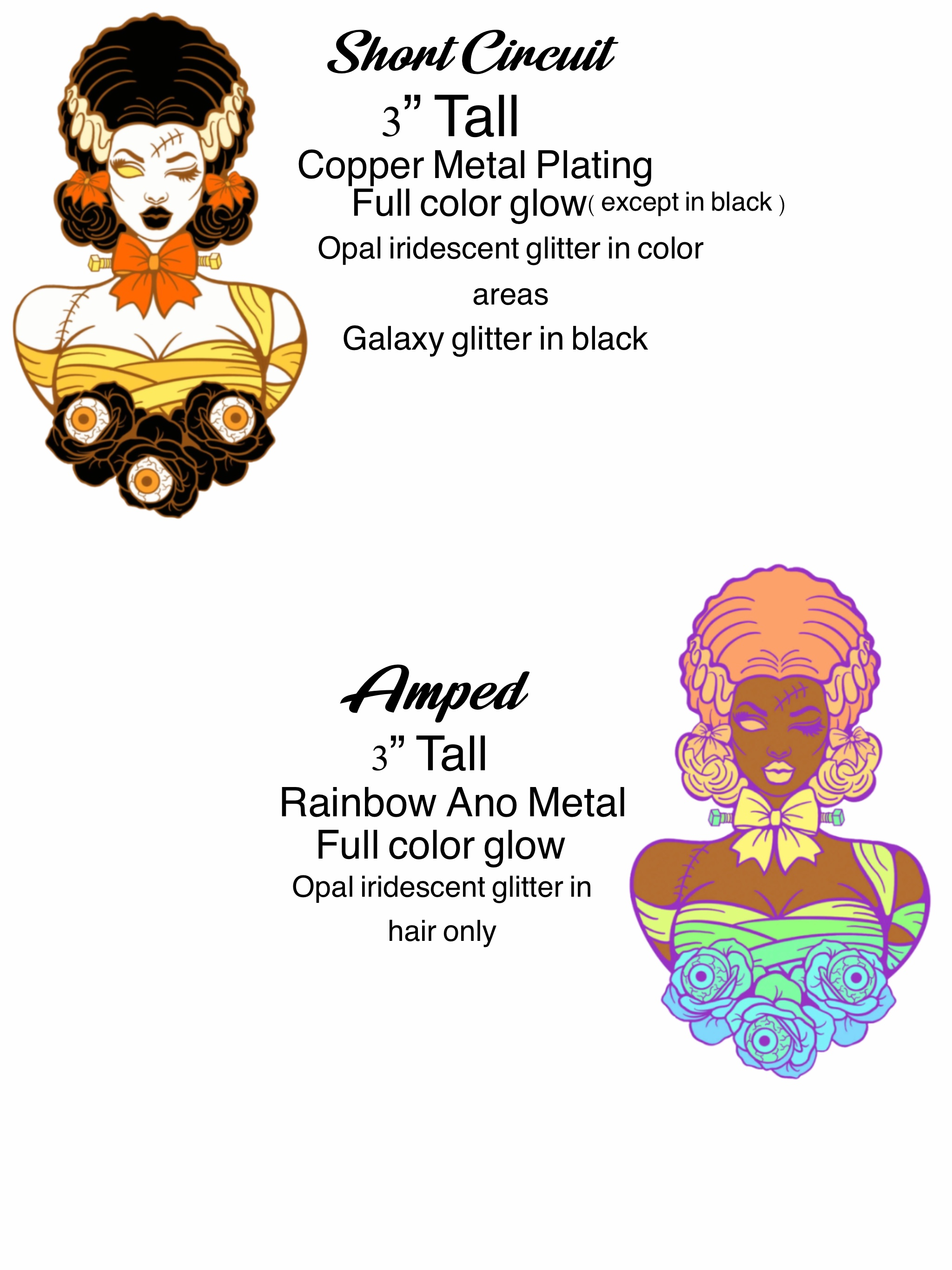Frankie Sparx is my new enamel art pin, and she is absolutely electric!!! She will be 3” tall, have all the fun glows and glitters tha make her really “ Spark”le! 6 variants, with a secret variant to unlock !! All she wants is love, so bring her home and let her shine! She also has available a 1” lightning bolt pin colored to match her! Details below!
