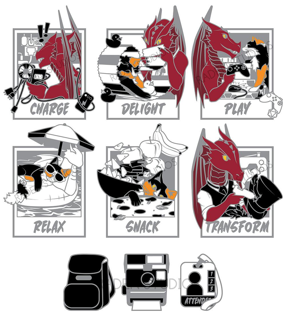 Meet Everett, a quiet but boldly adventurous dragon, and Rhona, a curious calico cat ready to tackle the busy weekend ahead. From crafting cosplay to gaming together, this pin series follows our cat and dragon friends as they experience a convention together.