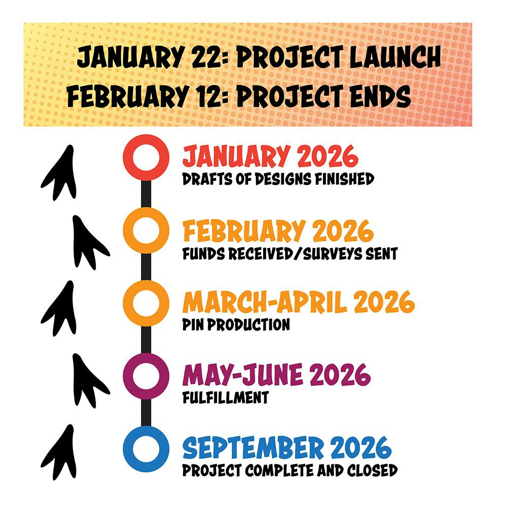 JANUARY 2026: Designs Fully Drafted; FEBRUARY 2026: Funds Received/Surveys Sent; MARCH-APRIL 2026: Pin Production; MAY-JUNE 2026: Fulfillment; SEPTEMBER 1, 2026: Project Complete and Closed
