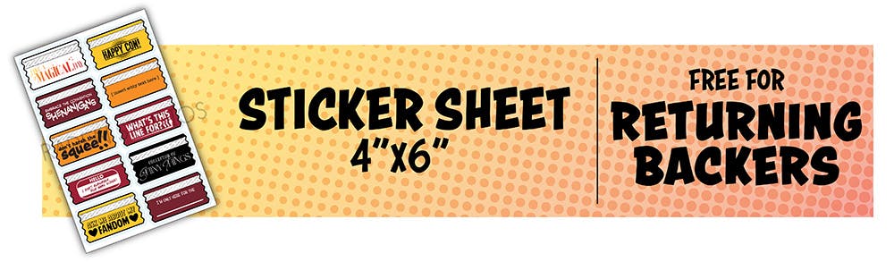 Returning Backers: Badge ribbons aren't just fun for badges! This 4x6 sticker sheet features multiple badge ribbons filled with convention fun. Each "ribbon" is roughly 1.5" wide.
