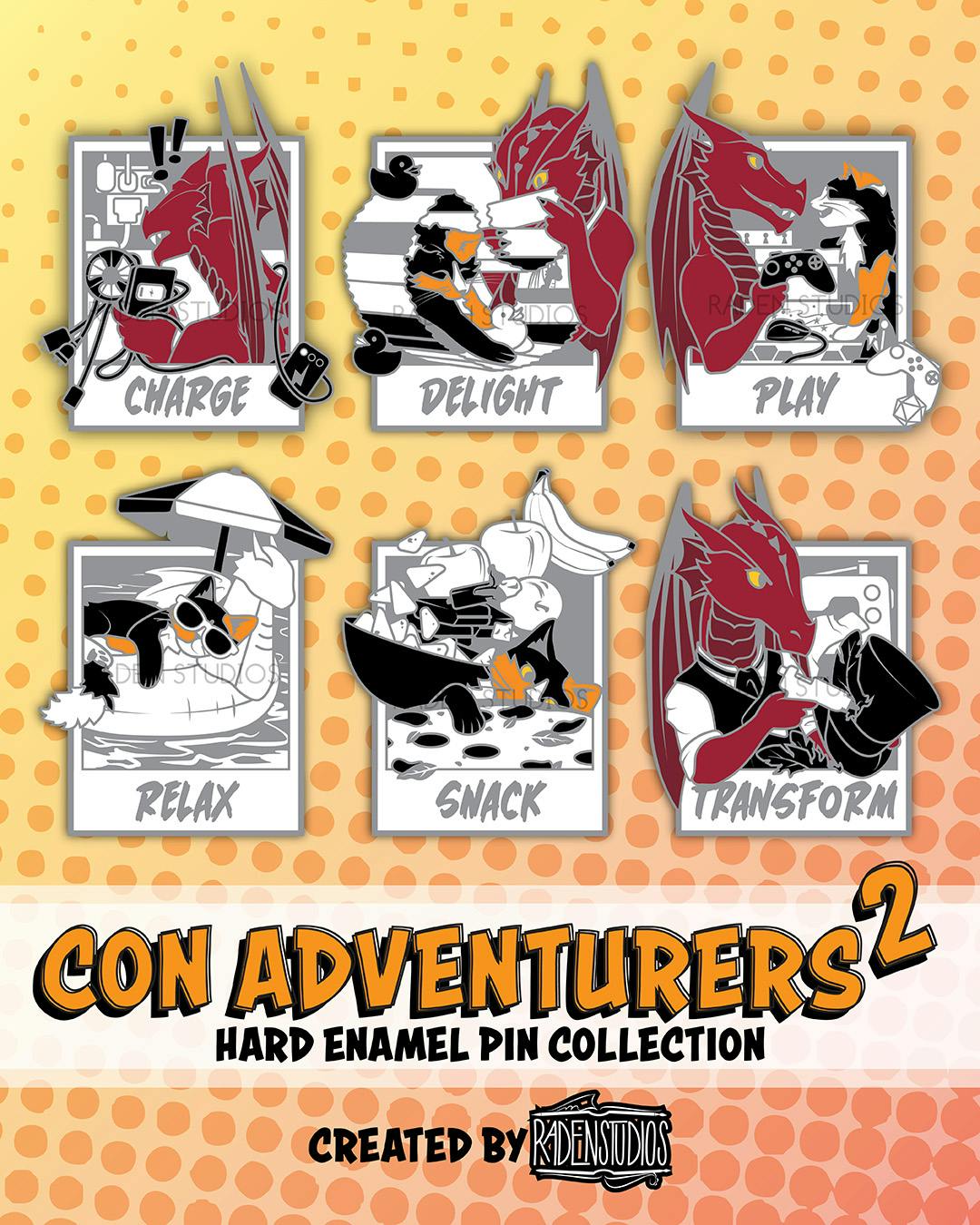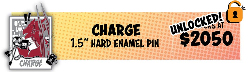 Below is the full set of six core pins, along with a reminder on our Artist Cross-Collab pin freebie! I'll note I actually already did a couple minor tweaks to PLAY and CHARGE so those will look a little different than they did in yesterday's reveal, but I'm happier with them. Pins from Con Adventurers series 1 will also be available as add-ons.