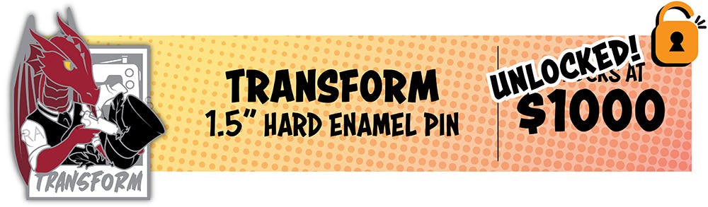 Thank you all so much, Adventurers! We're about 10 hours in on the first day and the campaign is FUNDED! That unlocks the initial TRANSFORM pin, set of three mini pins, and all the freebies (early bird, returning backer, and artist cross-collab). Thank you so much for such a strong start!
