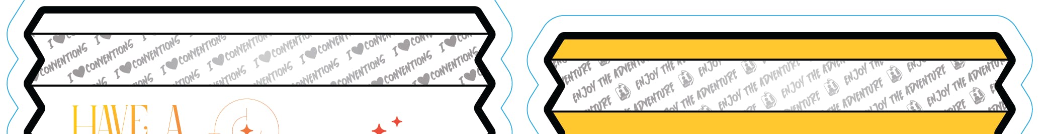 The "sticky" parts of the badge ribbons read "I <3 conventions" and "Enjoy the Adventure"