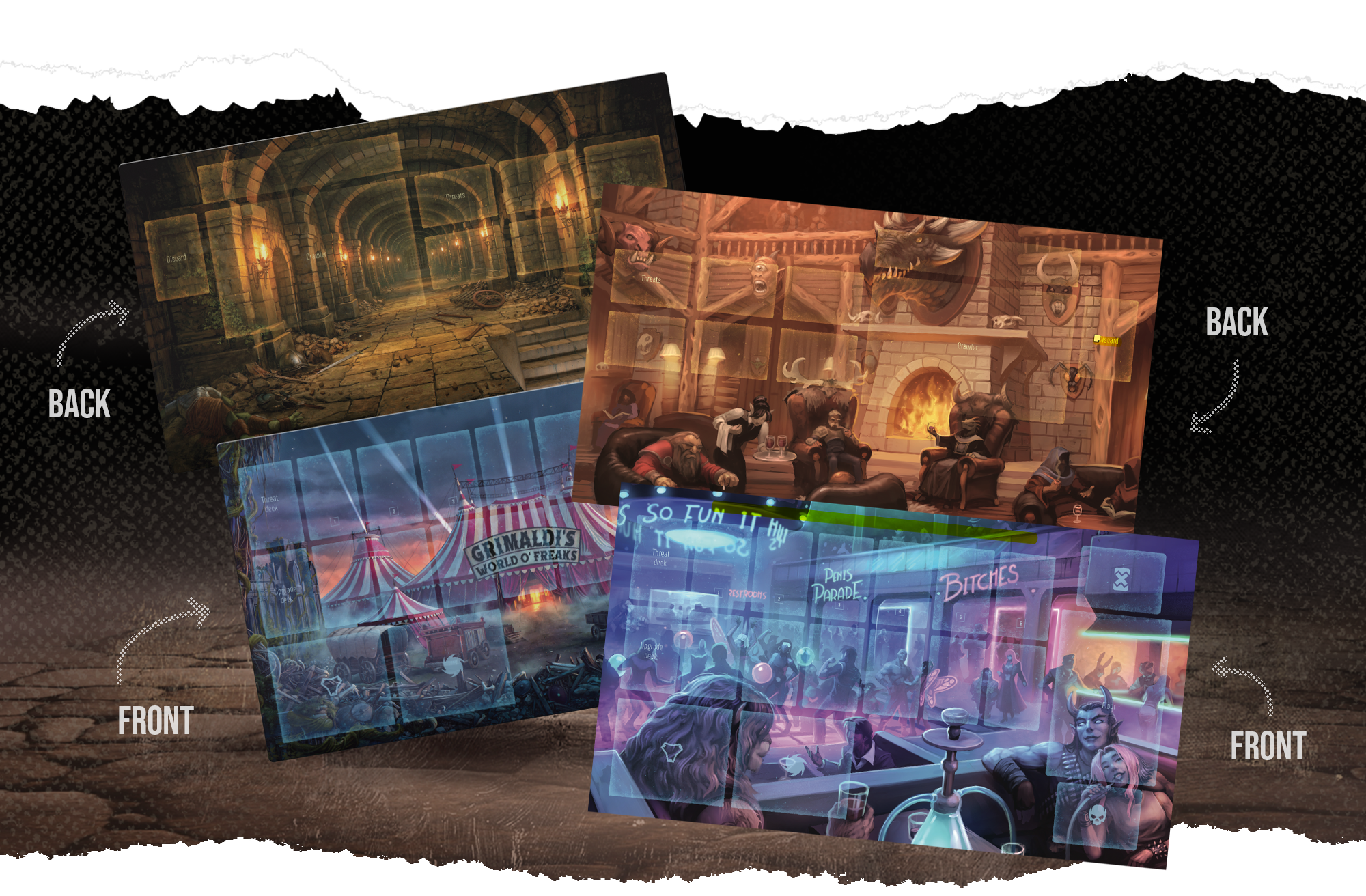 Normal / Solo Playmat: Featuring artwork of the World Dungeon with a stairway leading down to the next floor on one side, and Grimaldi's World of Freaks on the other, this mat will surely set the scene for delving into the World Dungeon!