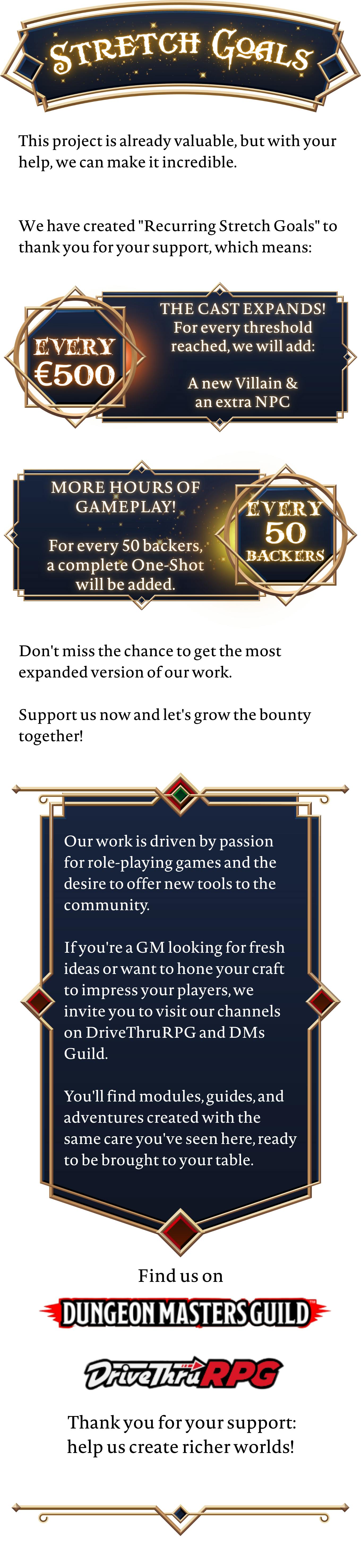 If you're a GM looking for fresh ideas or want to hone your craft, we invite you to visit our channels on DriveThruRPG and DMs Guild.