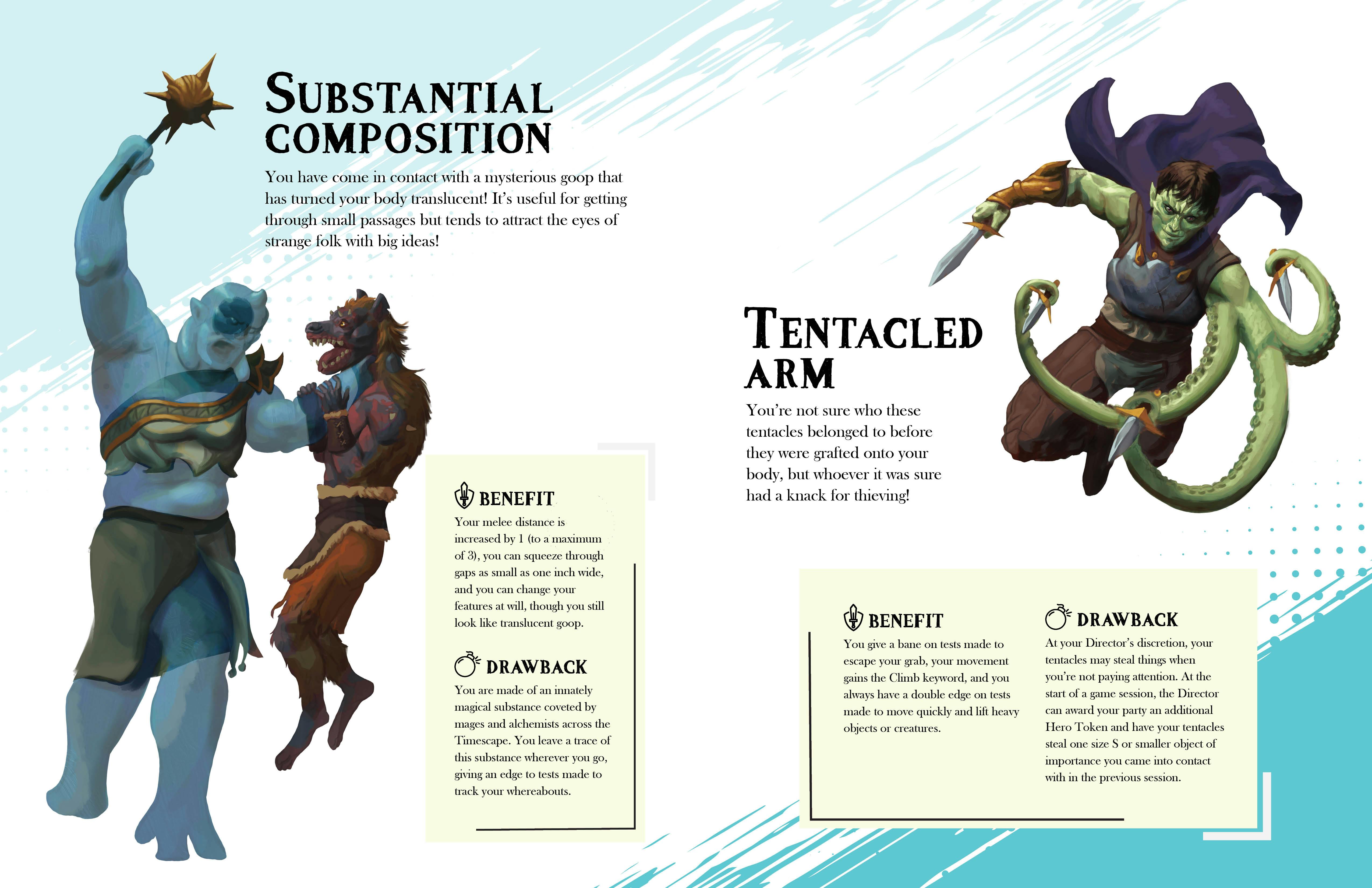 Examples of these complications are having sticky tentacle arms, growing three extra heads you can change out whenever you rest (or crit), and being made of a mysterious goop coveted by greedy mages!