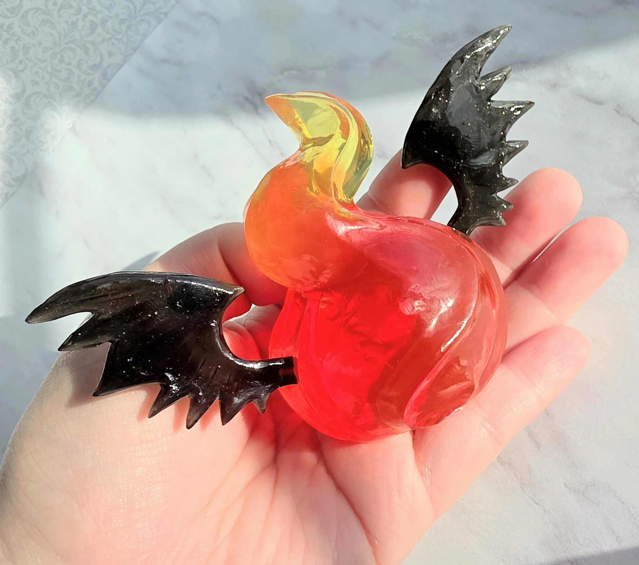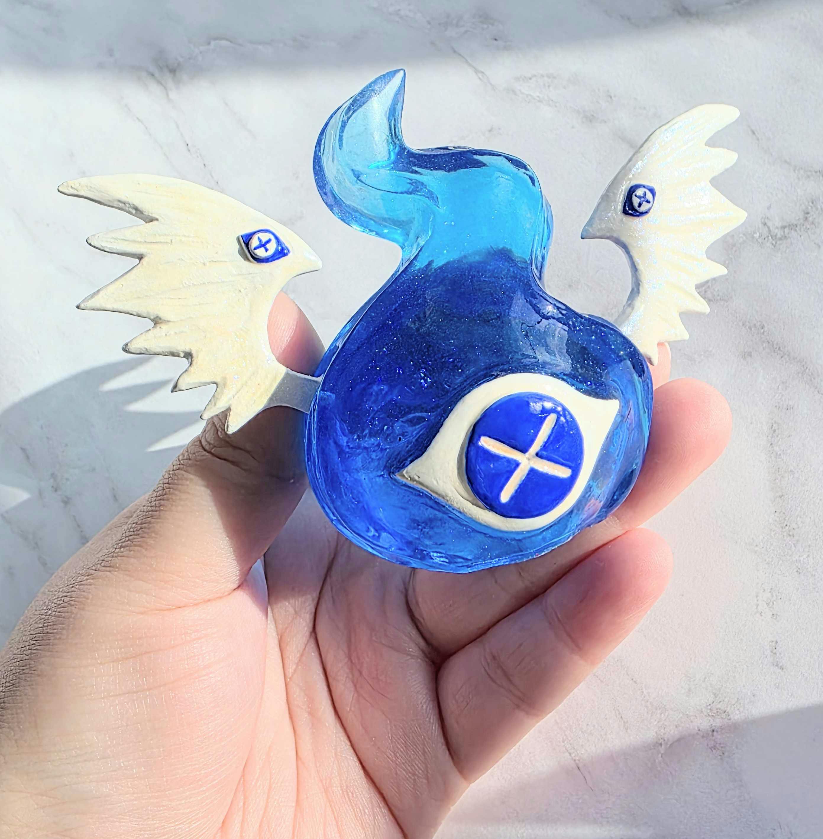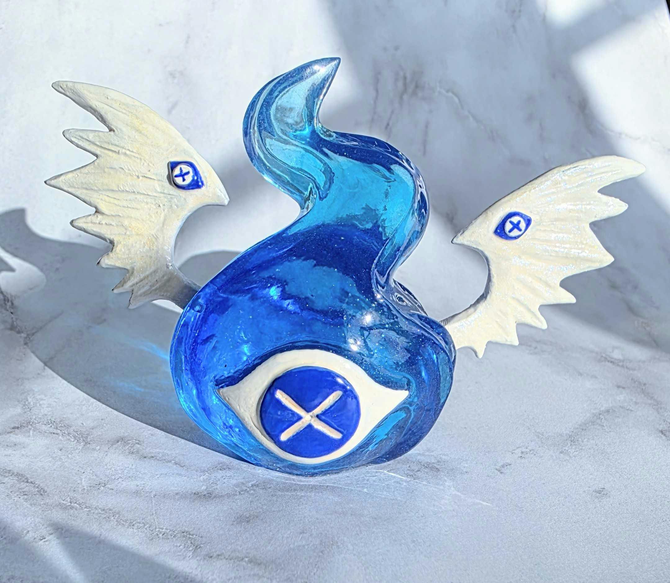Dumah resin statue (Limited Edition Blue): 3 inches tall and 4.5 inches wide. Has a clear gradient glitter body and glitter wings. All figures are hand made and painted so please expect variations between models, especially with the gradient as that's had poured! These are very limited in quantity!