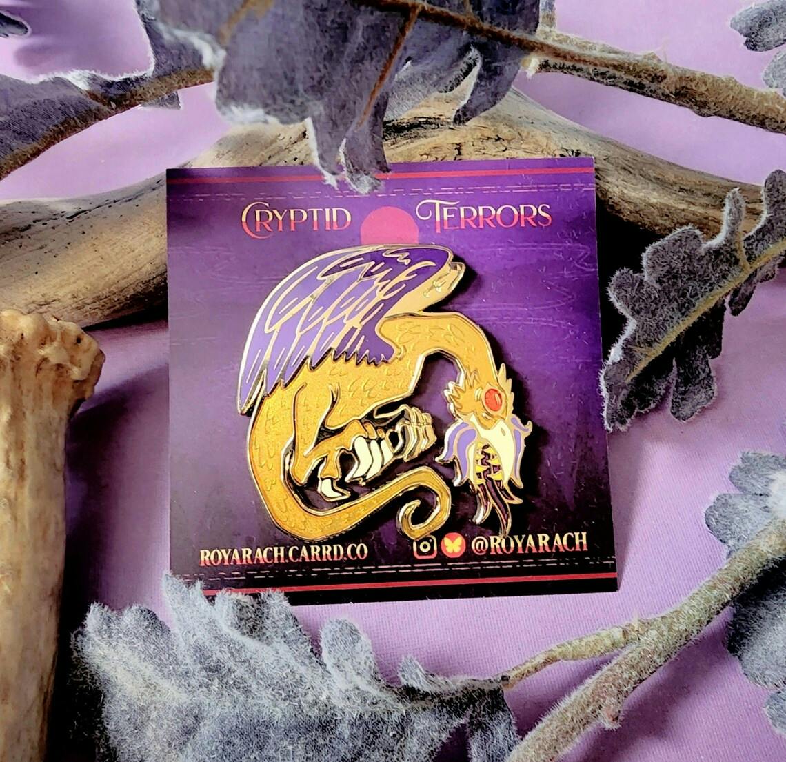 - A 2 inch gold hard enamel pin of a Snallygaster with sandblast and recessed metal details.