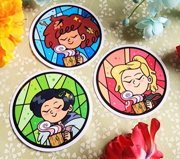 Comes with 1 random clear vinyl 3 inch sticker of any of the three girls!