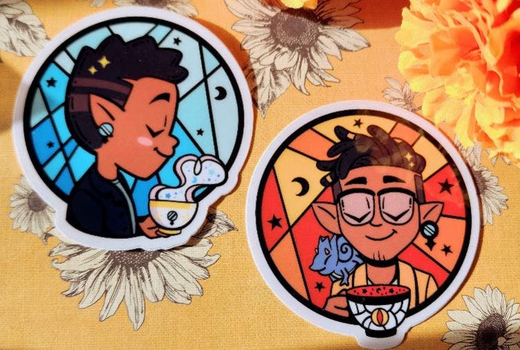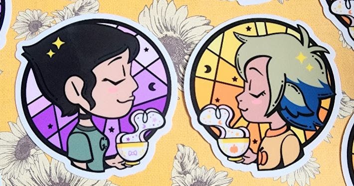 A set of Tea Time Witches pins: Gus, Time Skip Vee, and joint Vee/Masha pin. All pins are 1.5 inches each with a golden teapot dangle or chain for the joint pin. Comes with 3 random free clear stickers of any of these designs!