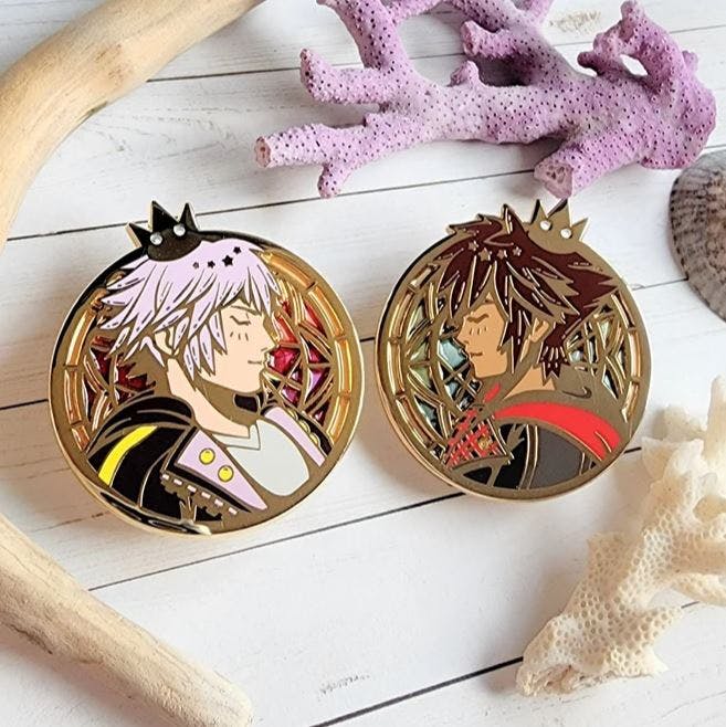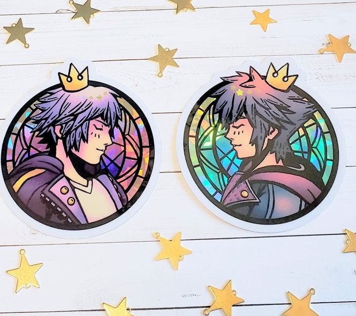 A bundle of both destiny island boys! Both pins are 2 inches big with "stained glass" backgrounds. Comes with both holo vinyl 3 inch stickers of the same design!