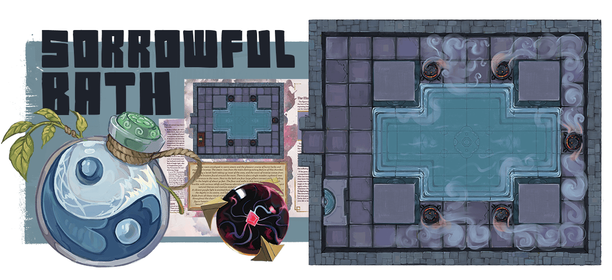 A cold gloomy miasma fills this chamber instead of hot steam. A lady in mourning does not appreciate visitors during her lamentful bath – and you better pray that this lady does not cry or scream, because that will be the last thing you will ever hear.