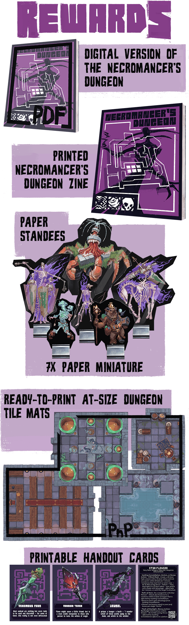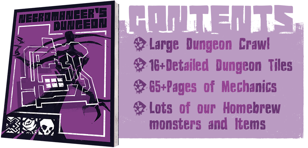 Homebrew. As expected, Necromancer’s Dungeon will have lots of monsters to face and loot to collect; and we will be creating all of it. Everything you need will be made by us and found in statblocks and the compendium included in the zine – you won’t need to search anywhere else for reference.