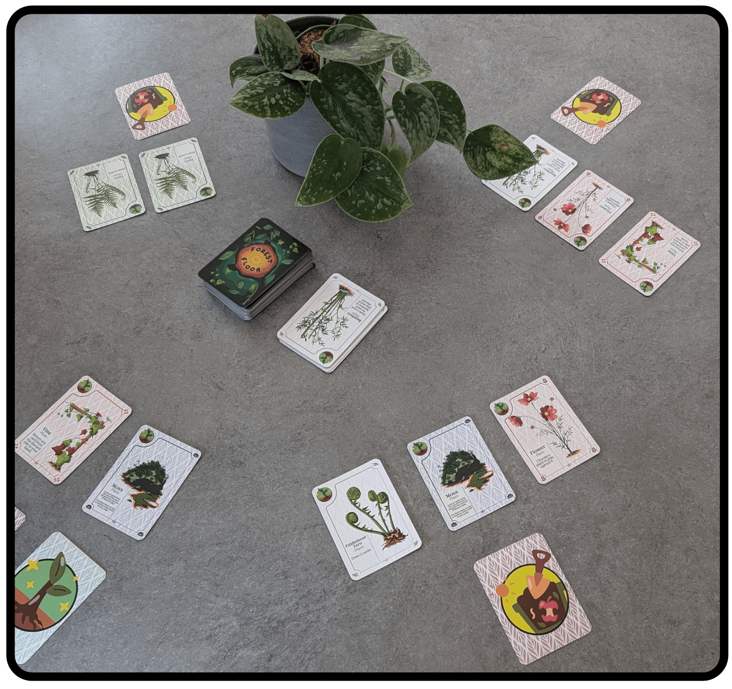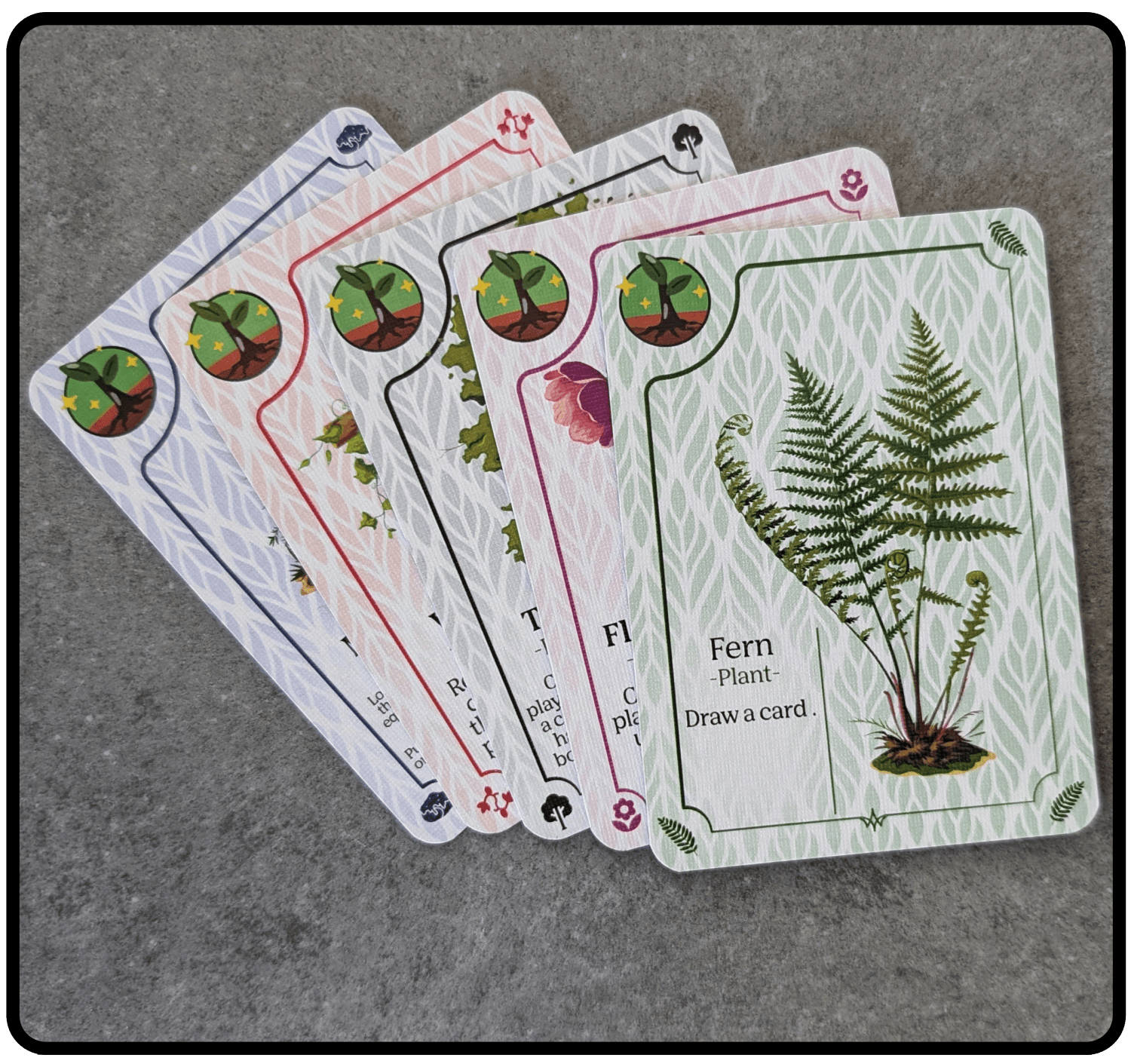 Forest Floor: Play fast, see clear. Card design prioritizes easy reading – keywords, symbols – in hand. No flipping, just smooth gameplay. Consistent symbol placement boosts readability for a seamless experience.