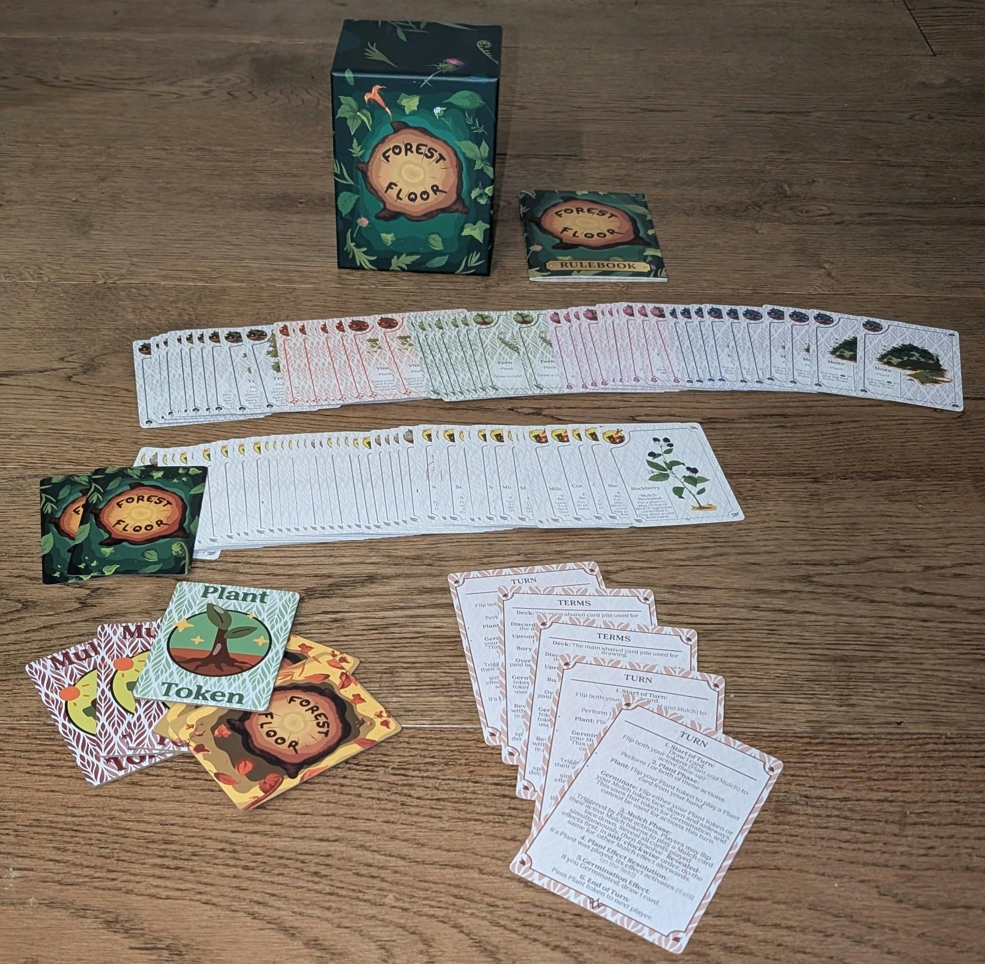 Forest Floor is a visually striking game with unique mechanics and surprising strategic depth for 2-5 players. With a take that focus and read time interaction together with Strategic deck management where knowing the top card is crucial.