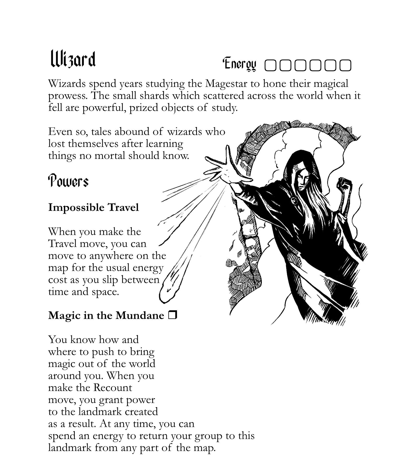 Magestar revolves around creating a map. Six core moves add to the map in different ways, with the four playbooks building on these core moves. Glimpse faraway locales as the Seer, or add bonus details as the keen-eyed Vampire. The Wizard and the Witch round out the roster as a knowledgeable mage who studies fragments of the Magestar, and one who uses artefacts influenced by it to both heal and harm.