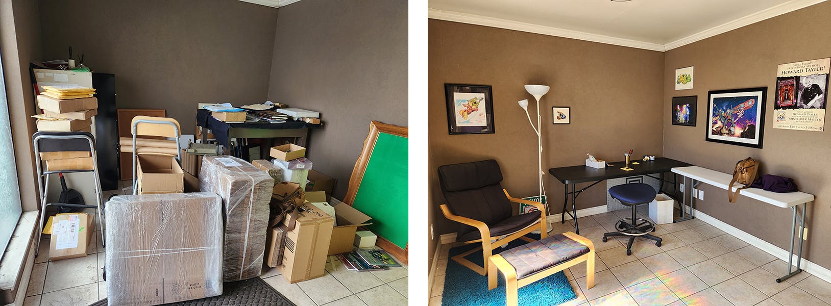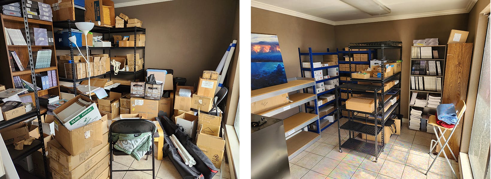 Arranging physical space My warehouse was kind of a mess. It was one of those messes that accumulate year after year when you run from one project to the next with out pausing to clean up properly. It took several months, new shelving, and a willingness to massively reorganize, but I now have a functional workspace. Here is a before and after of the room which I'll use to assemble SLSC packages. Oh! And because I previously showed you pictures of the partially finished side room, here it is complete. (Or at least Done for Now) Printing the last few physical items I need to get the bookmarks and note cards printed. I also need to create a thank you note and errata insert. Fortunately all of these things can be printed locally inside a week. I need to get it done soon so that I can create bundles.