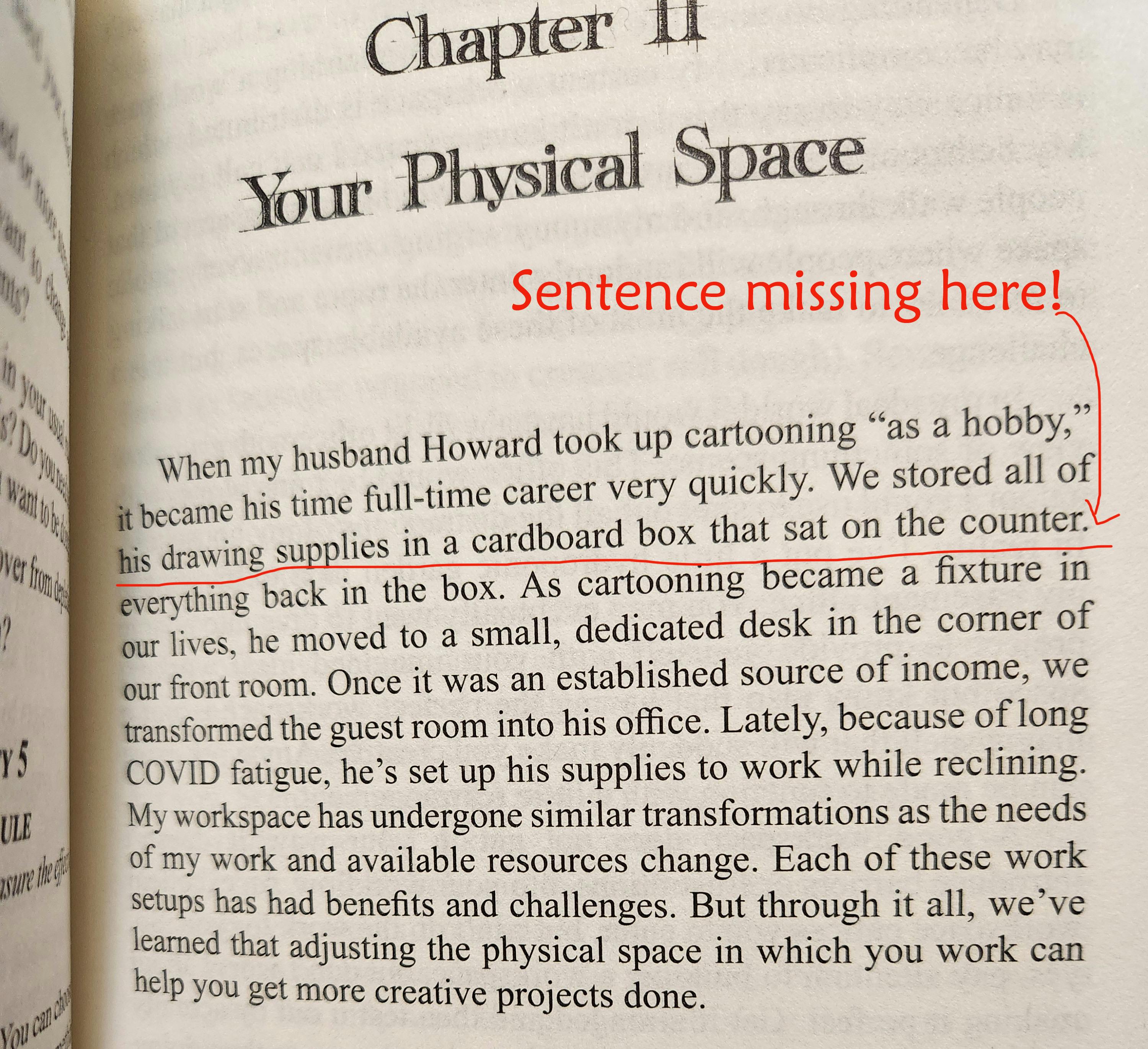 The missing words are: When he set up to work, he'd take over half the kitchen table. Then, after he was done, he'd stow This error almost certainly happened at the copy edit stage and was definitely my mistake. When I went back to the edit documents I could see that the missing words are a single line that I must have accidentally deleted while copy editing. Obviously this is the kind of mistake I don't want to have in my book, but fortunately the missing words do not materially damage the information provided by the chapter. (In fact if I'd been just a touch more thorough and deleted the fragment as well, probably no one would have noticed it at all.) I can't afford to have the book re-printed for this small error, so I will do what I can. I will send an insert out with every copy of the book I mail, explaining the missing words and what they are. I'll correct the error in all future editions. All of you backers will get an updated eBook version once I'm past the rush of shipping and the holidays. And I'll not spend too much time spinning in anxiety over my mistake.