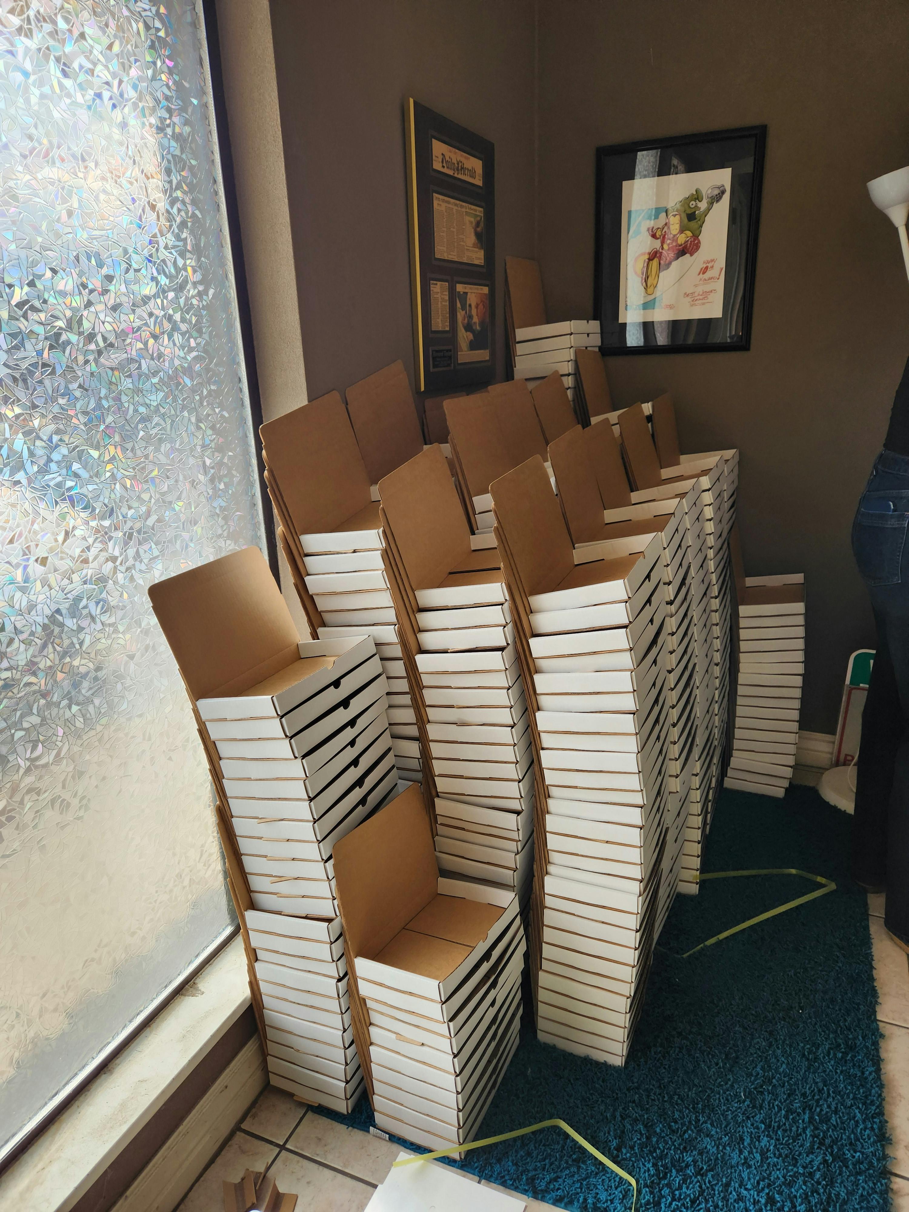 Today me and two helpers built more than 600 boxes that will be used to ship books. Look at my amazing helpers!