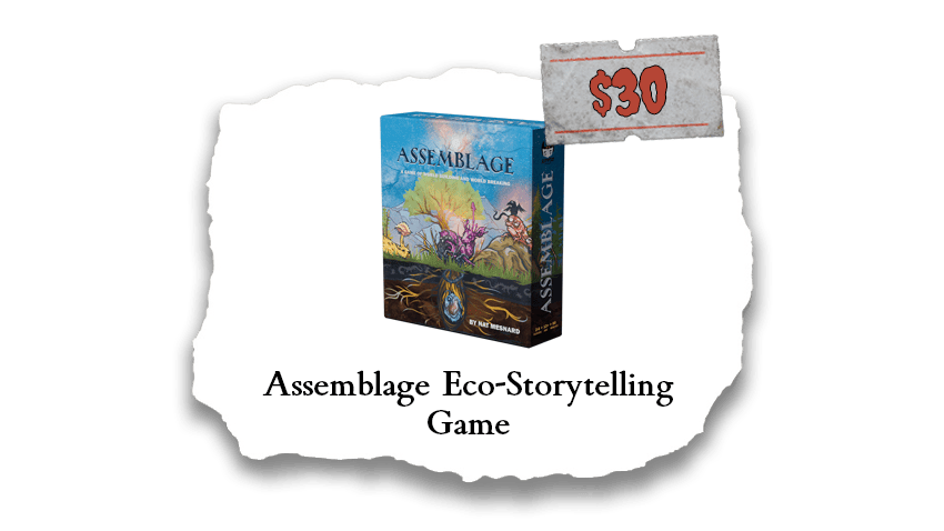 Together, become a weird ecology. When the world shatters, how will we survive?Assemblage is a card-based eco-fantasy storytelling game for 2-6 players where each player portrays an entire species—and collaborates in crafting an interdependent ecosystem on the verge of collapse. You'll begin by collectively choosing a strange and mysterious habitat. Then you will draw prompt cards and take turns describing the assemblage of species living there: history, relationships, adaptations, and myths. Then you'll encounter an epic environmental disaster—and explore what it means to survive.