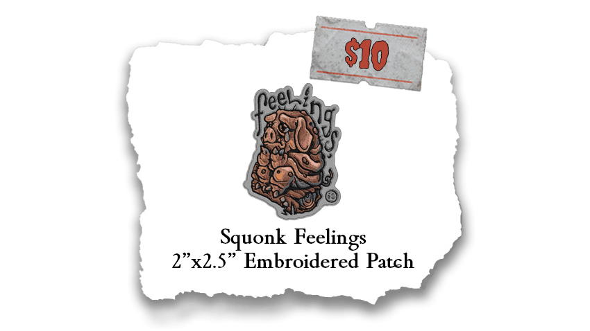 A 2" x 2.5" woven embroidered patch with iron on backing featuring everyone's favorite cryptid, the Squonk. Wear your cryptid feelings loud and proud. Image is a MOCKUP of the final patch.