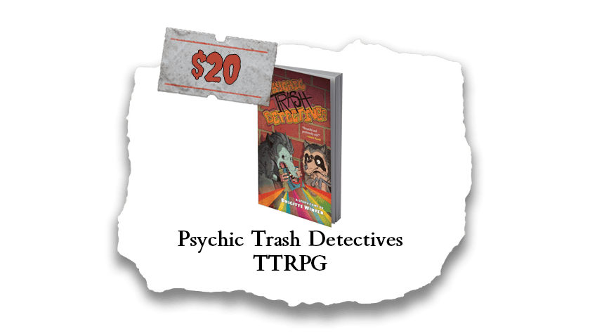 Live fast. Eat trash. Solve mysteries. Psychic Trash Detectives is a collaborative, shared-GM TTRPG for 3-5 players, about psychic trash animals solving the mysteries no one cares about. Players use actual trash to generate elements of the game world, resolve questions, and push the story forward. They create the setting of the game together too, mapping out on a hand-drawn map the weird places where their characters find their favorite trash. And when it comes to the psychic trash visions, they play weird, surrealist mini-games–like writing erasure poetry on trash, sketching with their eyes closed, and listening to playlists for musical inspiration–to determine the supernatural messages and memories. This game won 2024 Crit Awards for Best Indie TTRPG and Best Cover Art.