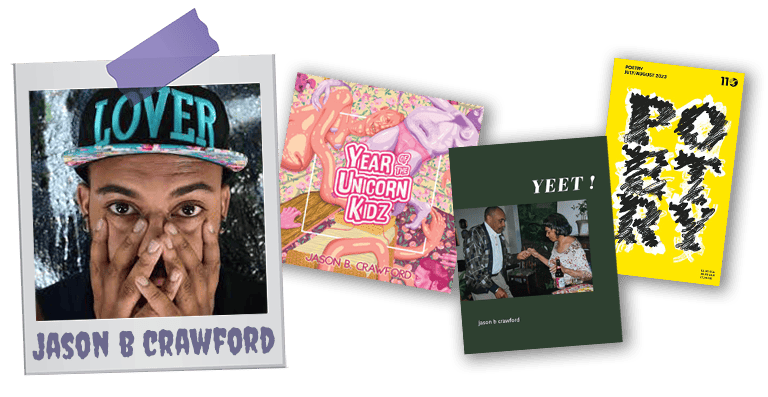 Jason B. Crawford is a writer born in Washington, DC and raised in Lansing, MI. Their debut full-length poetry collection Year of the Unicorn Kidz is available from Sundress Publications, and their second collection YEET! was the winner of the 2023 Omnidawn 1st/2nd Book Prize. They are a 2023 Lambda Literary Emerging LGBTQ Voices fellow. They are the winner of the Courtney Valentine Prize for Outstanding Work by a Millennial Artist, the winner of the Rhino’s Founders Prize, and a finalist for the Frontier’s Open prize. They were a finalist for the Tom Howard/Margaret Reid 2021 and 2022 Poetry Contest. They hold an MFA in poetry from The New School.
