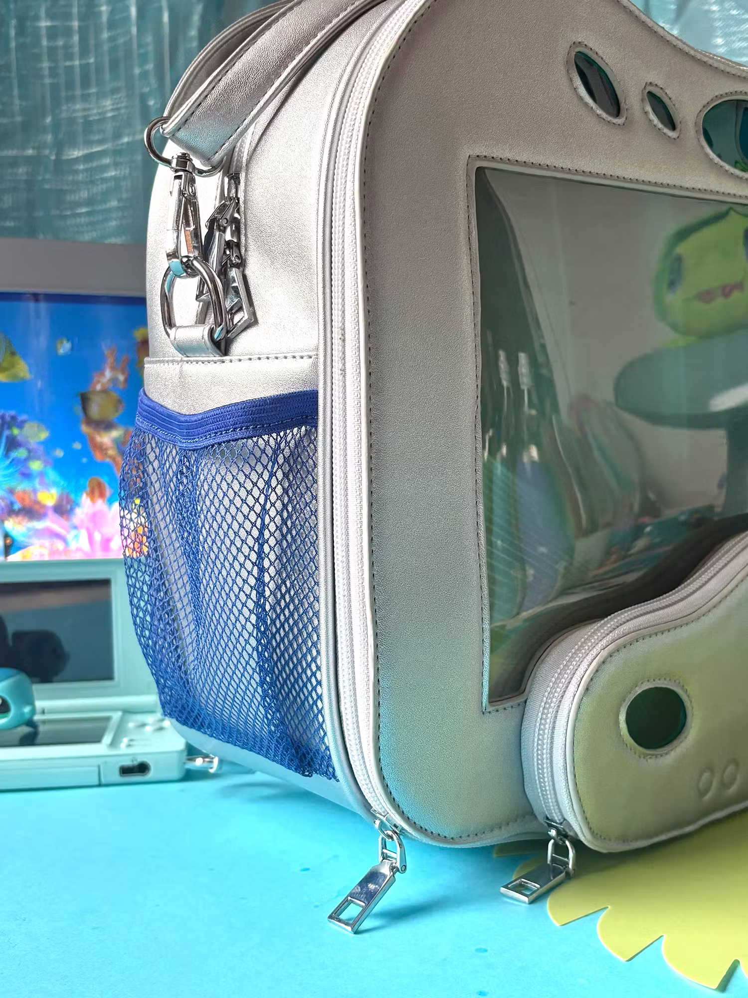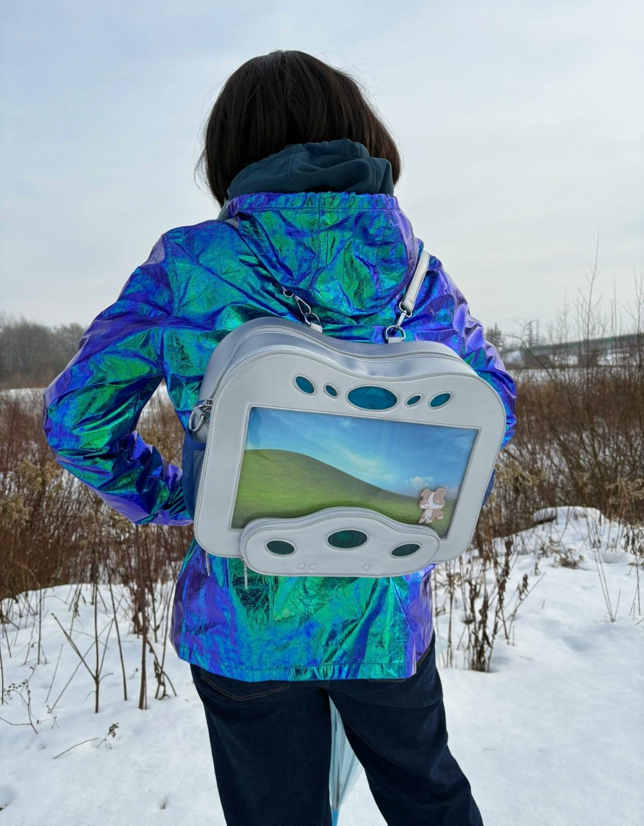 Customizable ita window with 3 different "computer wallpapers" inserts: There is a big transparent ita window at the frony to display your favorite enamel pins, keychains and flat trinkets.