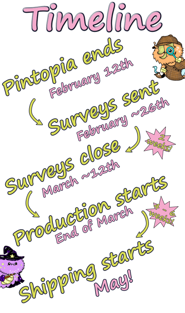 A couple of weeks after the campaign ends, we will send pledge manager surveys. There you will be able to pick what pins you want for your pledge and addons, give your shipping address and pay the shipping costs. We will keep the surveys open for about 2 weeks.