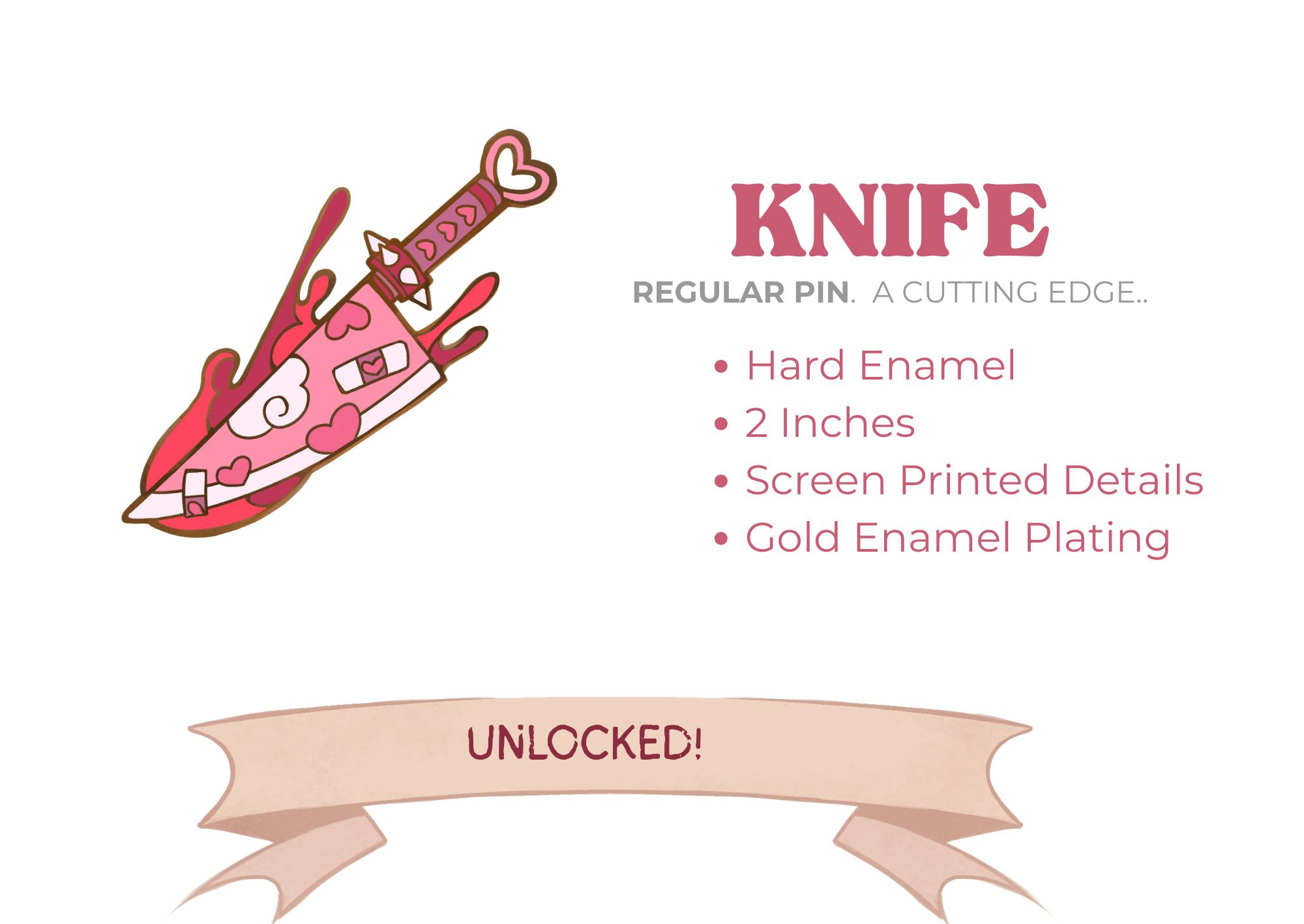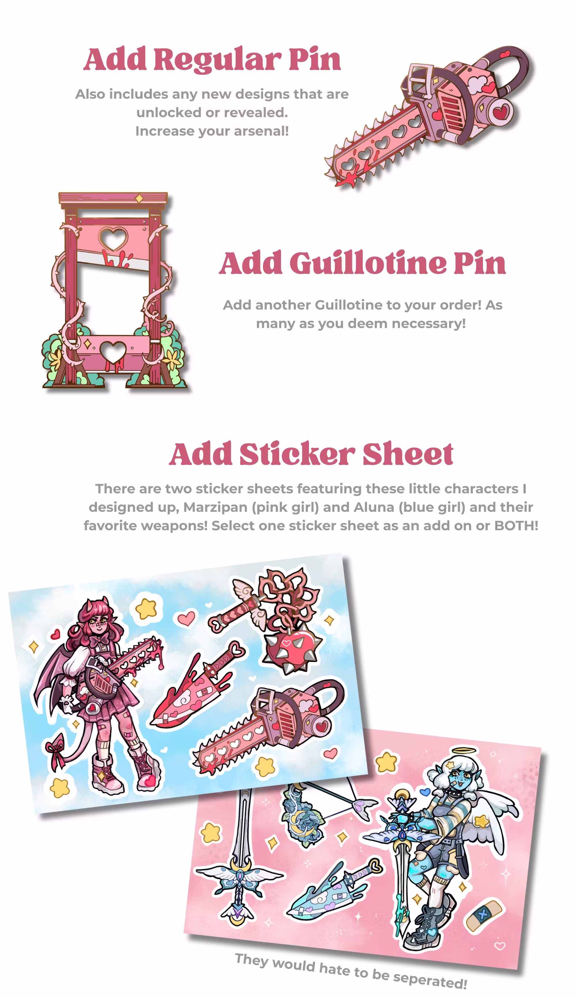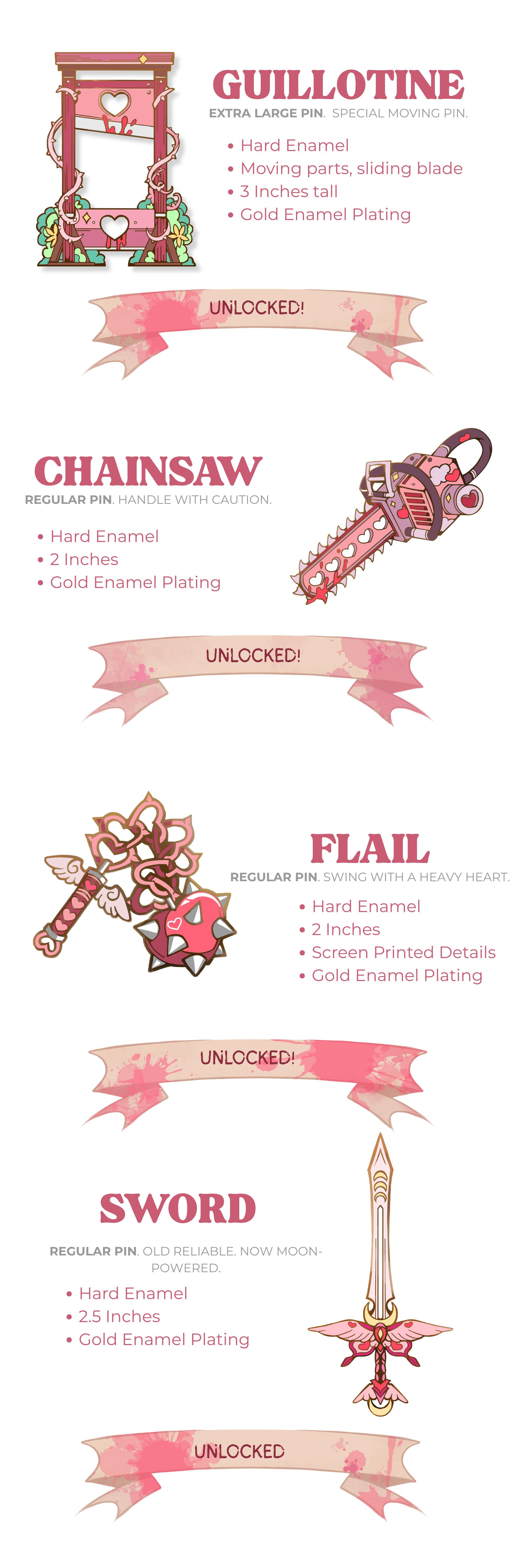 The initial goal of $1000 will unlock both the Specialty Guillotine sliding pin and the regular Chainsaw pin. The rest of the pins will be unlocked as the campaign progresses! Pledge for the pins you want to see now, as you will not be charged until the campaign ends and pledging helps unlock every goal!