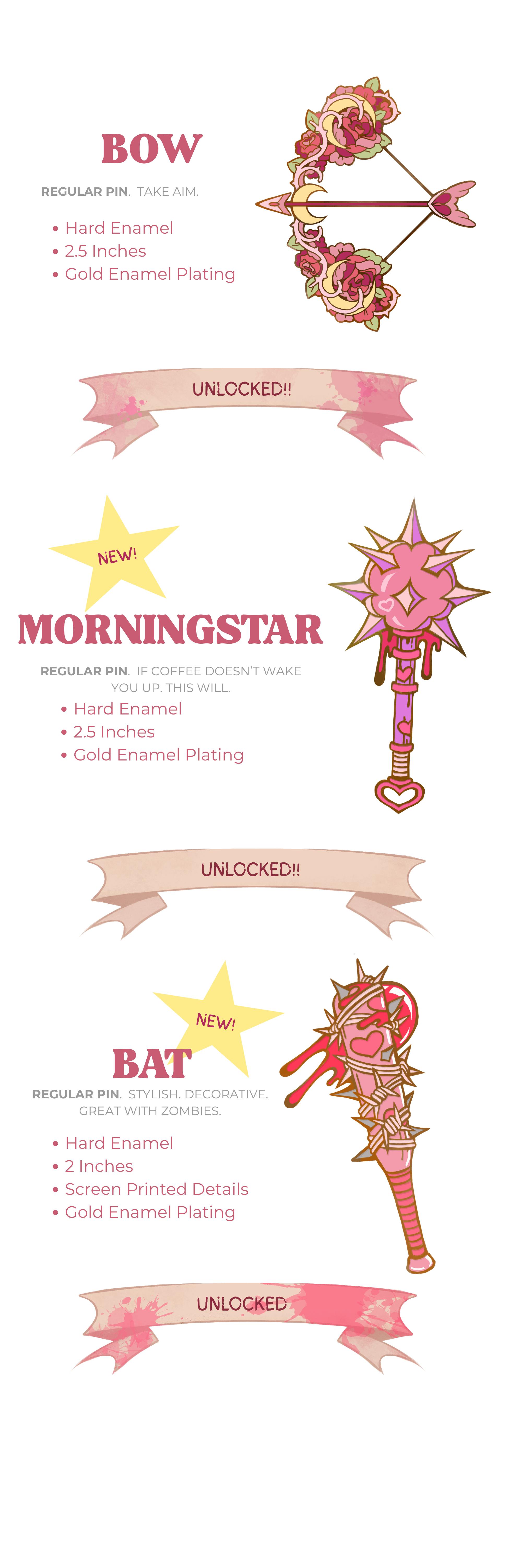 ...Tucked away in a dreamy arsenal in the sky these weapons have sat idlily by, waiting for the day their champions return to use them... Welcome to Pastel Weapons, a collection of hard enamel pins inspired by different weaponry and soft, pink, pastel colors. Do not let looks fool you, they can be just as useful as one covered in blood and rust.