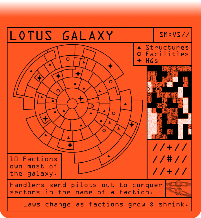 The galaxy is split between 10 factions, each one wanting to own the entire thing. Pilots don't interact directly with factions--they are little more than a boot knife in this consumer war. The factions are represented by the Handlers, who align with (and go against) different factions, peddle propaganda narratives to pilots in order to assure missions are completed properly, and have the greatest impact in the politics of the world.