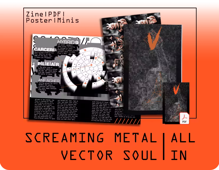 Screaming Metal: Vector Soul is a 48 page booklet featuring layout, design, and writing by me. Here are some preview spreads. It's full color, staplebound, and with your pledge I'll have the safety of working on it into the summer. It'll be printed in July with fulfillment happening Late July and August. This backerkit will be updated with WIP pages and pdfs as its worked on.