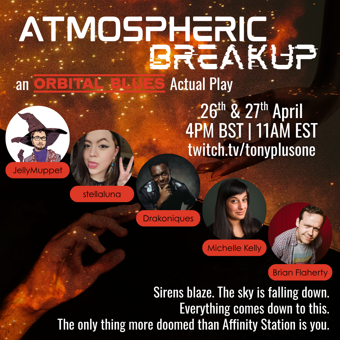 To celebrate the success of Orbital Blues Month, Zach Cox (aka JellyMuppet and one of the co-creators of Orbital Blues) will be running a special two part Actual Play of their new adventure ATMOSPHERIC BREAKUP over on the PlusOneEXP twitch channel on the 26th and 27th of April.
