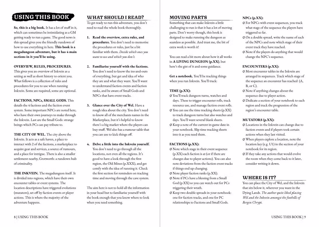 I took the same approach for the overview of the book. It’s easy for an adventure of this size to feel intimidating: our answer to this problem is a single spread overview that guides you through how to digest the book.