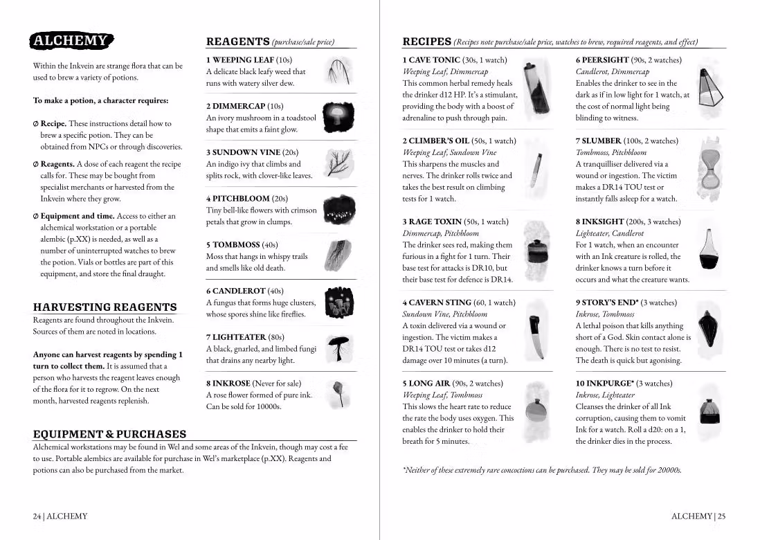 And all the additional sub-systems in the book. Alchemy fits on one spread: procedures, reagents (ingredients), and recipes.