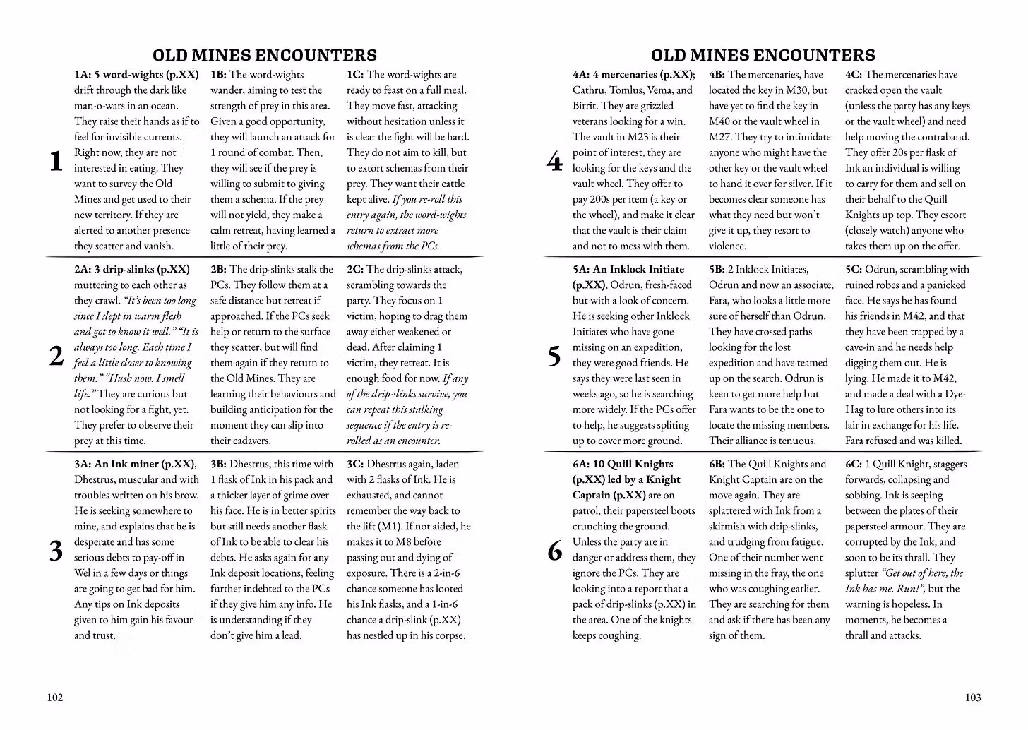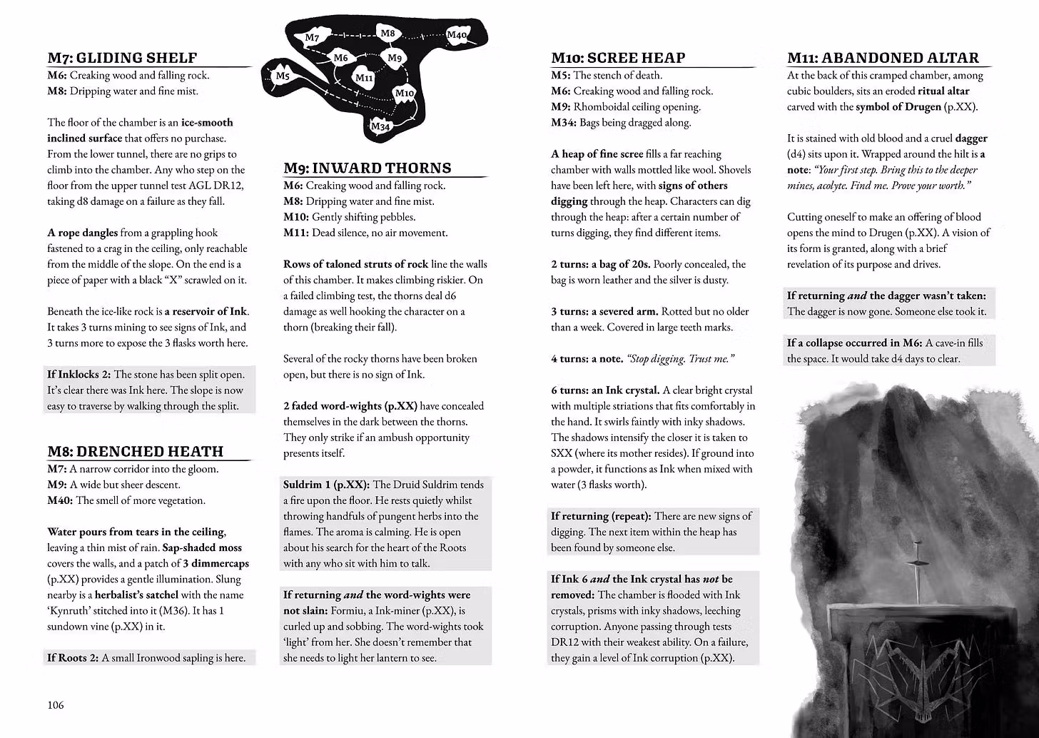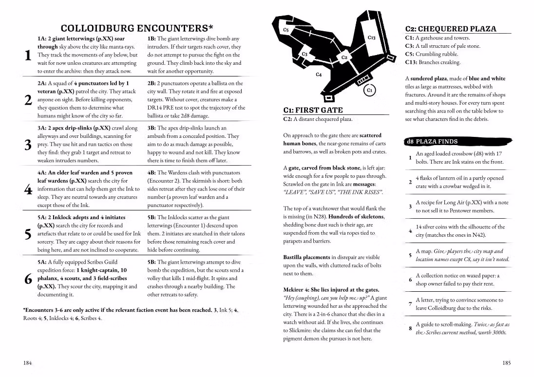 This is where a lot of the magic happens. We get 6 encounter sequences, which offer evolving situations to give the subjects of encounters their own goals and agency outside of PC interaction. We have a saying (my editor, my playtesters, and I) that “the Inkvein never waits.”