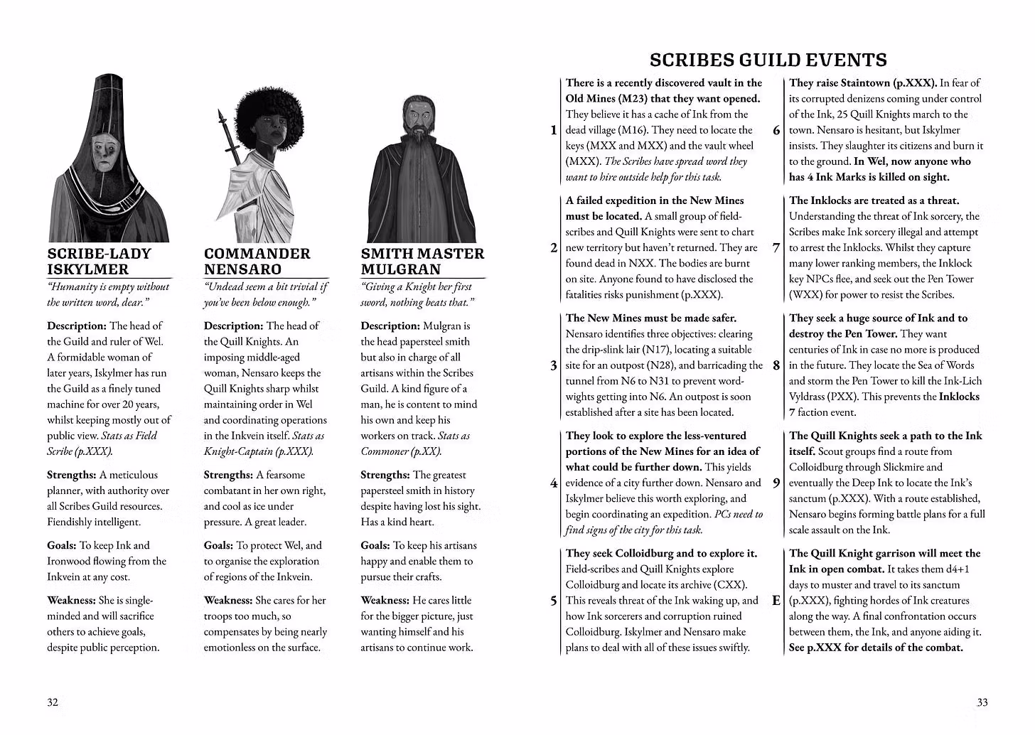 Some of the other factions have differences: their base might be a whole region of the Inkvein, they might only have one ‘leader’, and in the case of the Ink itself, there’s 10 pages of nasty creatures rather than one spread of members.