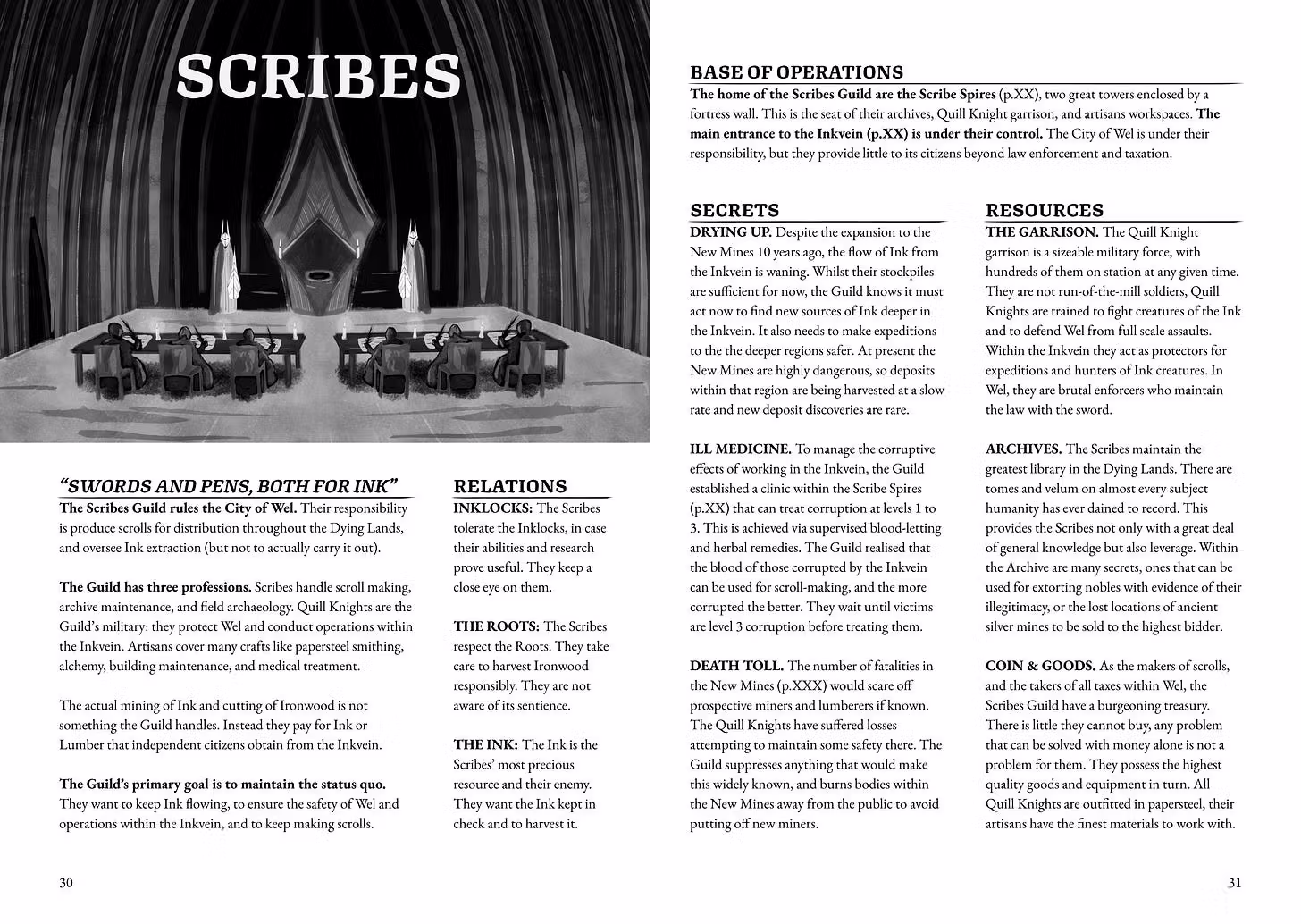 There are 4 factions in Inkvein and they are detailed. We’ll look at the Scribes Guild as our example. This is the faction responsible for making spell scrolls with the Ink collected from the Inkvein. They also control the city above the dungeon, the City of Wel.