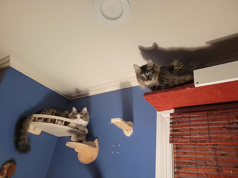 Doyle (white and tan) sits in a corner wall perch. Verne (black and gray) sits on a shelf above a window