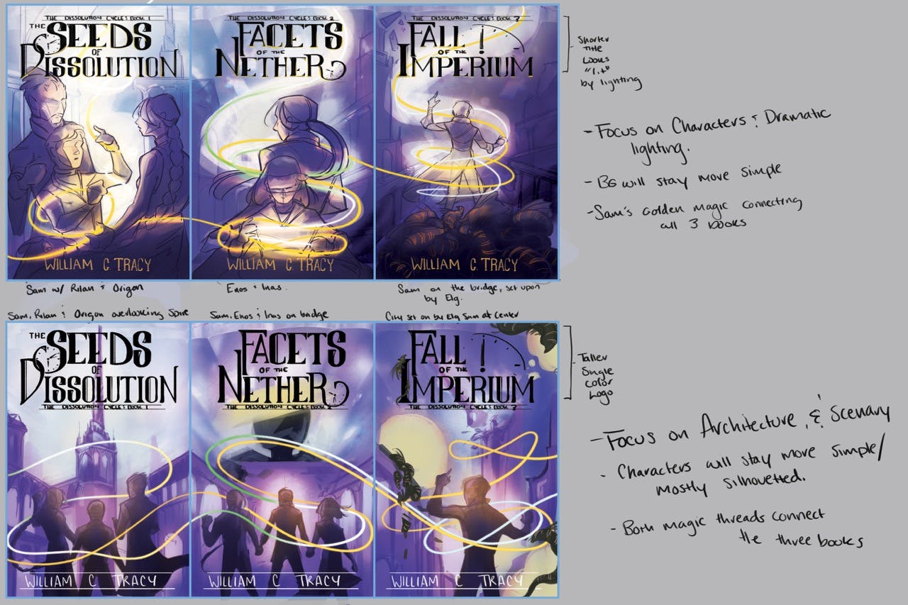 First, here are both concepts for the trilogy, with notes from Spoon on composition. I thought it would be fun to share, and shows the development process. The top covers are leaning more to the fantasy side, with more dramatic lighting and character focus. The bottom set leans more to the science fiction side, showing off the architecture of the main city in the book, as well as some of the plot events, but with less emphasis on the characters.