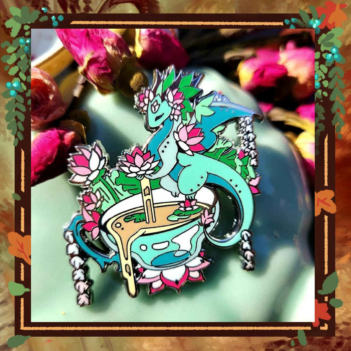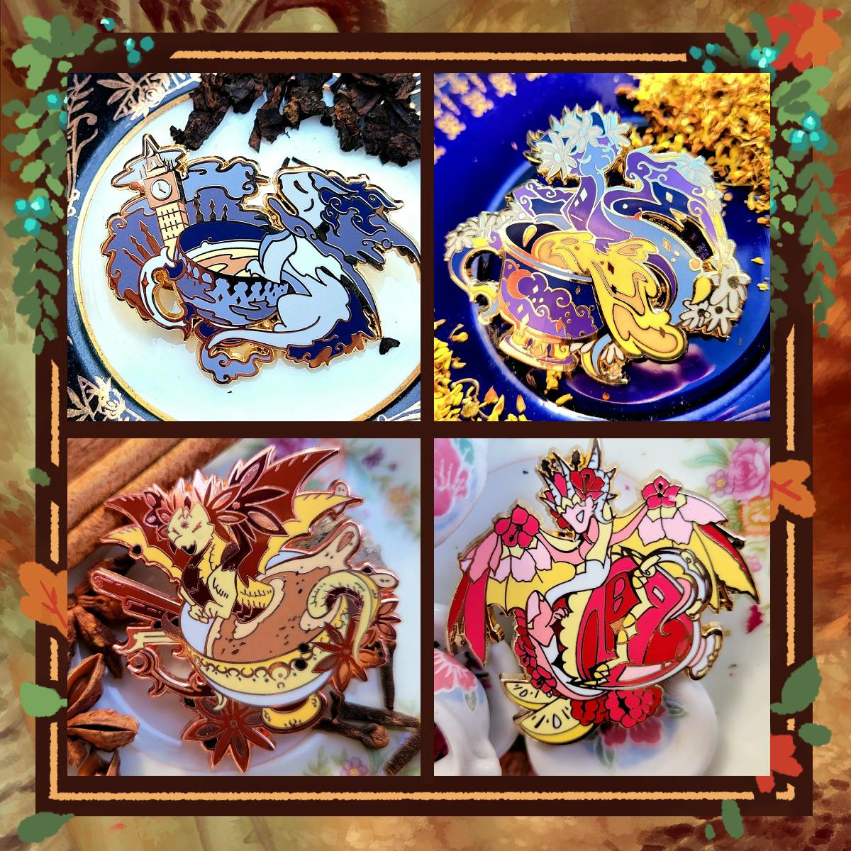 The enamel pins you see above are from my Mystic Tea Party Dragon from 2022. The first is Lotus Flower, then London Fog, Sleepy Time Chamomile, Masala Chai, and Raspberry Hibiscus with a slice of lemon. I love every one of my tea dragons, and I am particularly happy with my London fog! I'm so proud of coming up with the big-bed to represent the foggy streets of London, after all, that's what the tea showcases right?! And focusing on dreams for Chamomile was so fun! but Lotus Flower is my favorite pin, making the glass teacup look like a pond, --I'm so happy with that idea. π