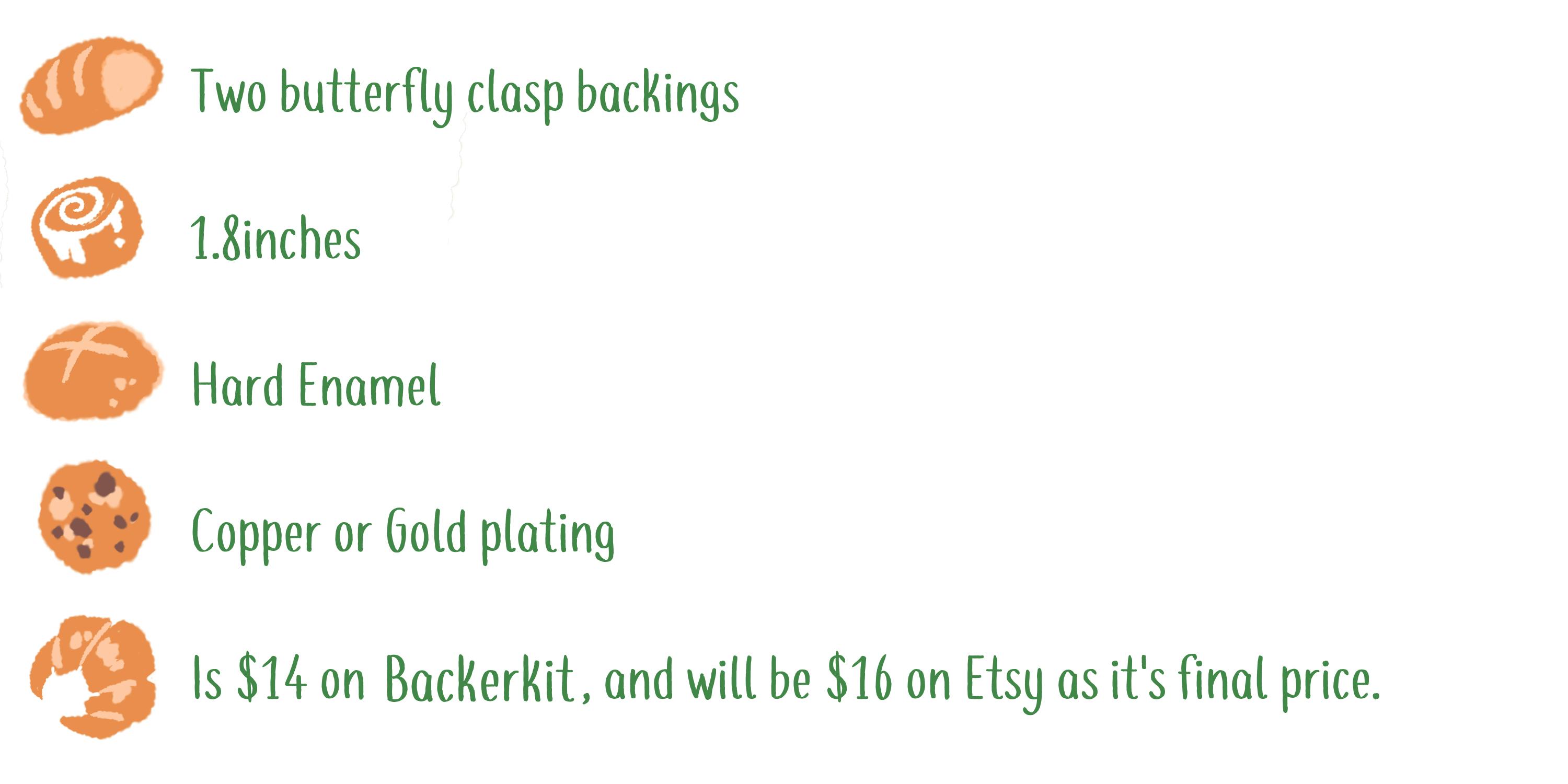 Of course I had to feature the Tea pins as past examples. I have been working with my manufacturers since 2020, I really cannot talk them up more. The quality is always fantastic, and our past backers and customers on our Etsy would agree! We use butterfly, clasp, backings for all of our enamel pins.