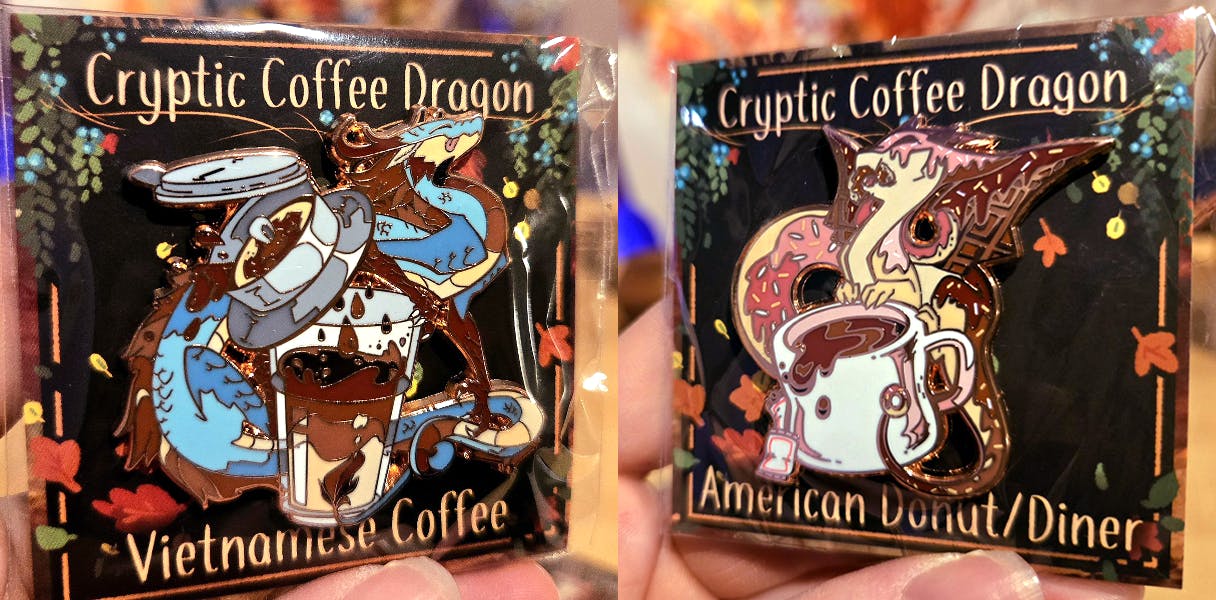 So, essentially, I am fulfilling my previous Coffee Dragon Kickstarter literally this week! And of course, I have plenty of inventory beyond the Kickstarter, so the Coffee Dragon pins shall be available as add-ons to pair nicely with your tasty dessert dragons! 💙