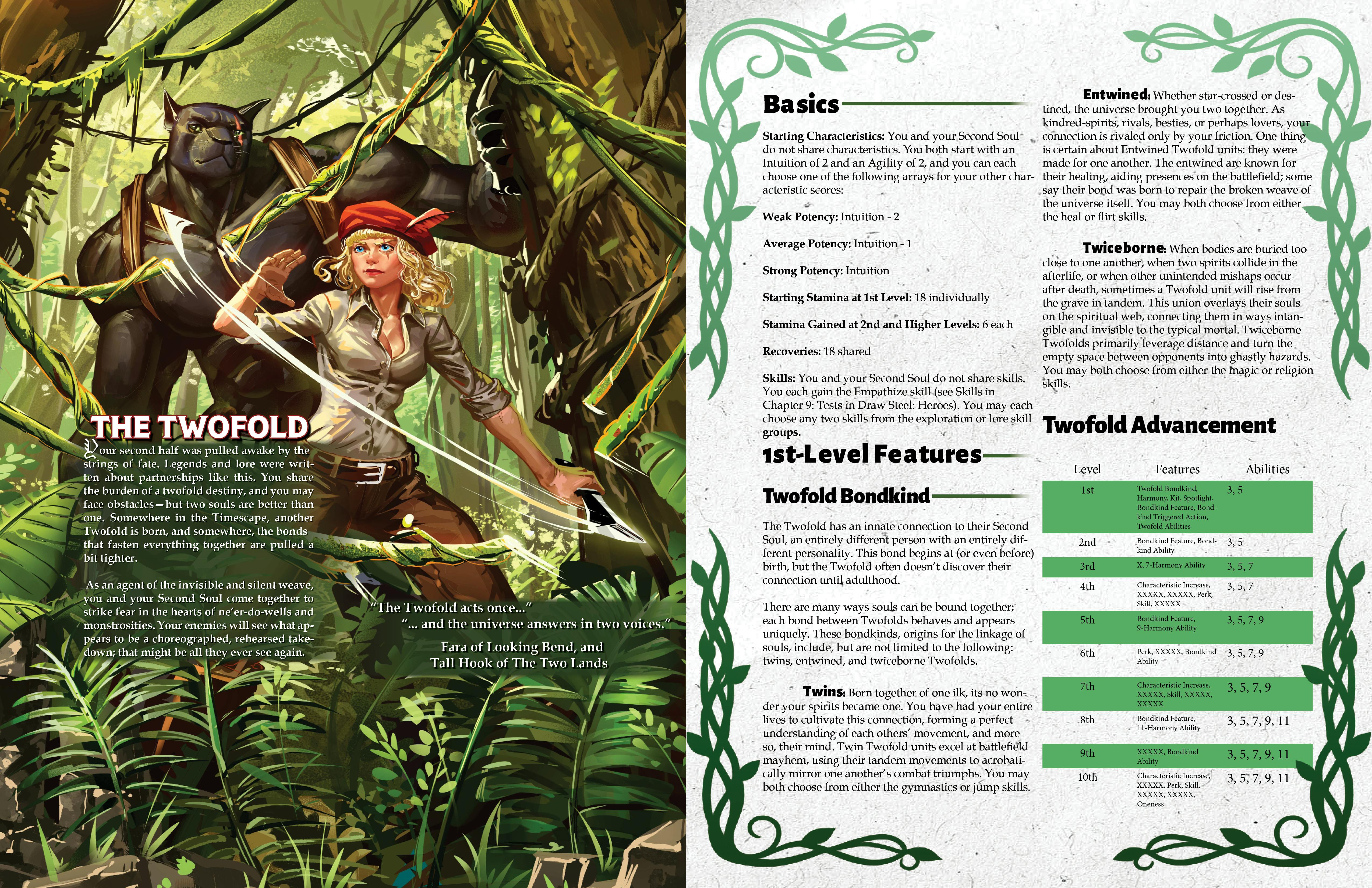 The Twofold is a third-party class designed for MCDM's tabletop roleplaying game Draw Steel. Designed for two players, this class plays like two choreographed dancers enacting their deadly routine on the battlefield, empowered by their inborn magical connection to one another. This class is designed around using movement to strategically create or remove space between you, your Second Soul, the rest of your allies, and even your enemies. More than anything, this is a class for two separate players who want a shared experience unlike anything tabletop roleplaying games typically offer.