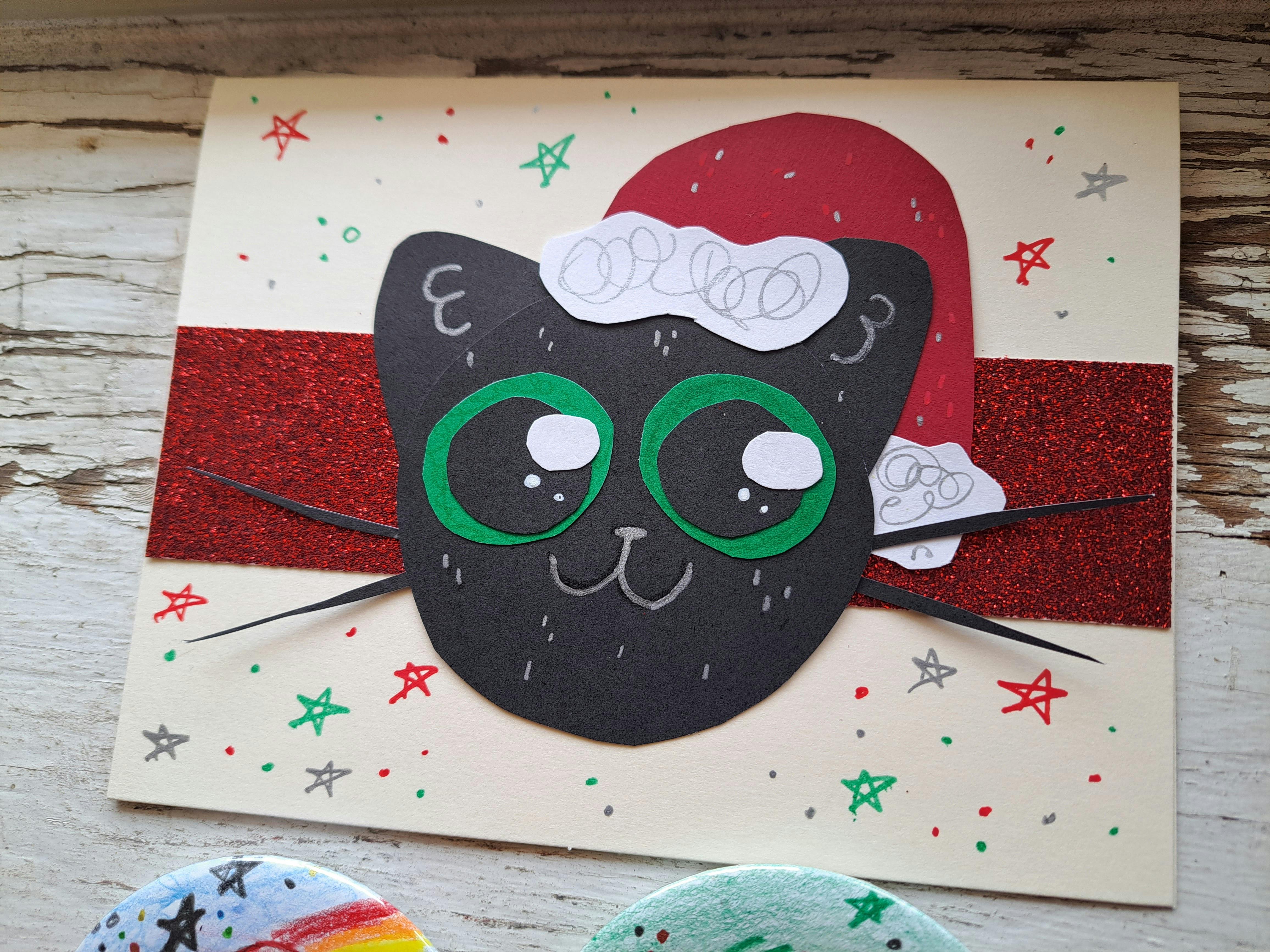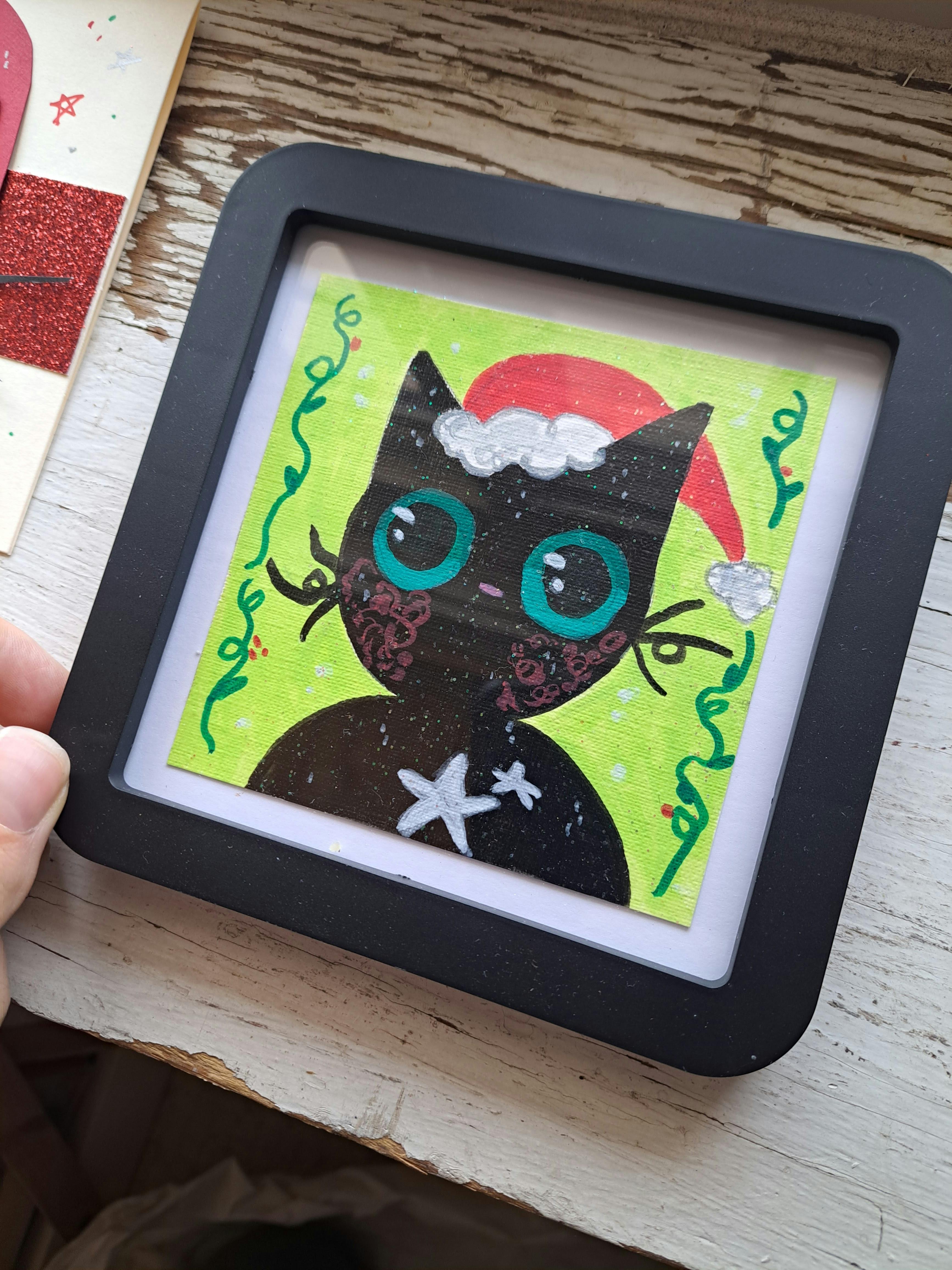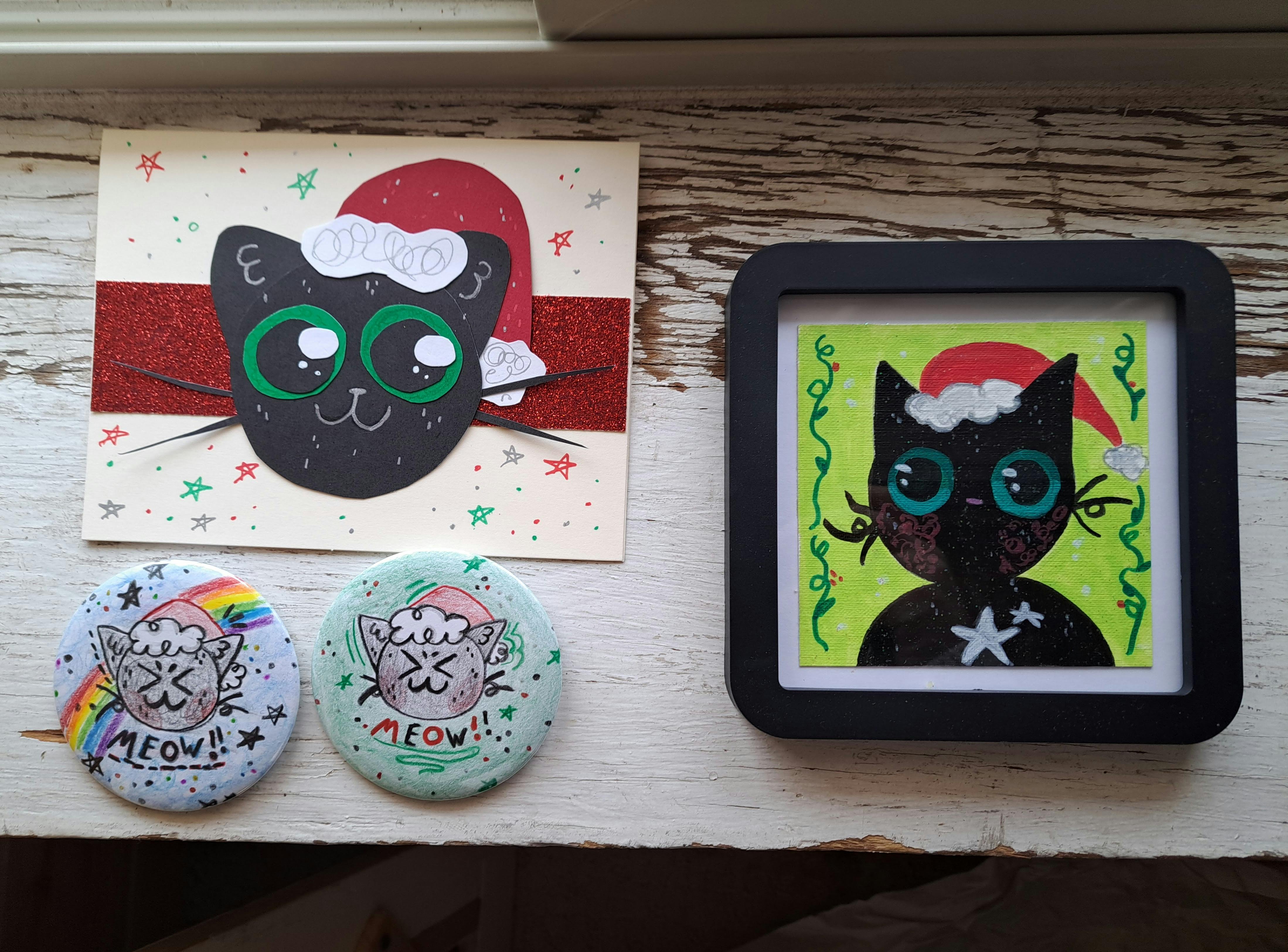 First, I wanted to finally post the pictures of the raffle items! I've been working on these the whole campaign and I think they turned out SOOO cute!! Each item is handmade by me! We have an acrylic painting in a frame, a card made of handcut paper, and two original 3" buttons pressed on our button machine! All of the pieces have some sort of super cute glittery effect. Also, did you know Santa Paws' eyes have been green this whole time? SURPRISE!!